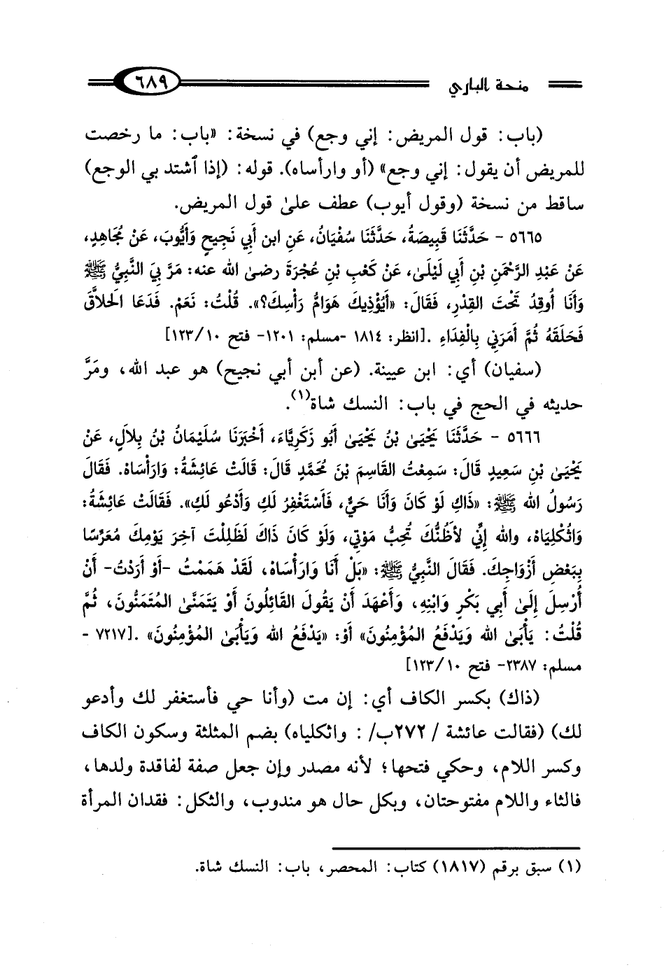 5665 - حَدَّثَنَا قَبِيصَةُ، حَدَّثَنَا سُفْيَانُ، عَنِ ابْنِ أَبِي نَجِيحٍ، وَأَيُّوبَ، عَنْ مُجَاهِدٍ، عَنْ عَبْدِ الرَّحْمَنِ بْنِ أَبِي لَيْلَى، عَنْ كَعْبِ بْنِ عُجْرَةَ رَضِيَ اللَّهُ عَنْهُ: مَرَّ بِيَ النَّبِيُّ صَلَّى اللهُ عَلَيْهِ وَسَلَّمَ وَأَنَا أُوقِدُ تَحْتَ القِدْرِ، فَقَال: "أَيُؤْذِيكَ هَوَامُّ رَأْسِكَ؟ " قُلْتُ: نَعَمْ، فَدَعَا الحَلَّاقَ فَحَلَقَهُ، ثُمَّ أَمَرَنِي بِالفِدَاءِ.