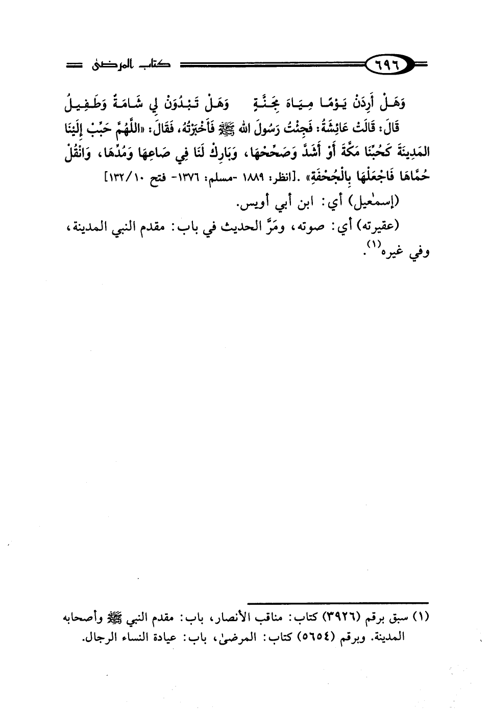 قَال: قَالتْ عَائِشَةُ: فَجِئْتُ رَسُولَ اللَّهِ صَلَّى اللهُ عَلَيْهِ وَسَلَّمَ فَأَخْبَرْتُهُ، فَقَال: "اللَّهُمَّ حَبِّبْ إِلَيْنَا المَدِينَةَ كَحُبِّنَا مَكَّةَ أَوْ أَشَدَّ، وَصَحِّحْهَا، وَبَارِكْ لَنَا فِي صَاعِهَا وَمُدِّهَا، وَانْقُلْ حُمَّاهَا فَاجْعَلْهَا بِالْجُحْفَةِ".