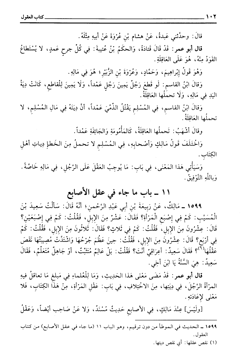1599 - مَالِكٌ عَنْ رَبِيعَةَ بْنِ أَبِي عَبْدِ الرَّحْمَنِ أَنَّهُ قَالَ سَأَلْتُ سَعِيدَ بْنَ الْمُسَيَّبِ كَمْ فِي إِصْبَعِ الْمَرْأَةِ فَقَالَ عَشْرٌ مِنَ الْإِبِلِ فَقُلْتُ كَمْ فِي إِصْبَعَيْنِ قَالَ عِشْرُونَ مِنَ الْإِبِلِ فَقُلْتُ كَمْ فِي ثَلَاثٍ فَقَالَ ثَلَاثُونَ مِنَ الْإِبِلِ فَقُلْتُ كَمْ فِي أَرْبَعٍ قَالَ عِشْرُونَ مِنَ الْإِبِلِ فَقُلْتُ حِينَ عَظُمَ جُرْحُهَا وَاشْتَدَّتْ مُصِيبَتُهَا نَقَصَ عَقْلُهَا فَقَالَ سَعِيدٌ أَعِرَاقِيُّ أَنْتَ فَقُلْتُ بَلْ عَالِمٌ مُتَثَبِّتٌ أَوْ جَاهِلٌ مُتَعَلِّمٌ فقال سعيد هي السنة يا بن أَخِي