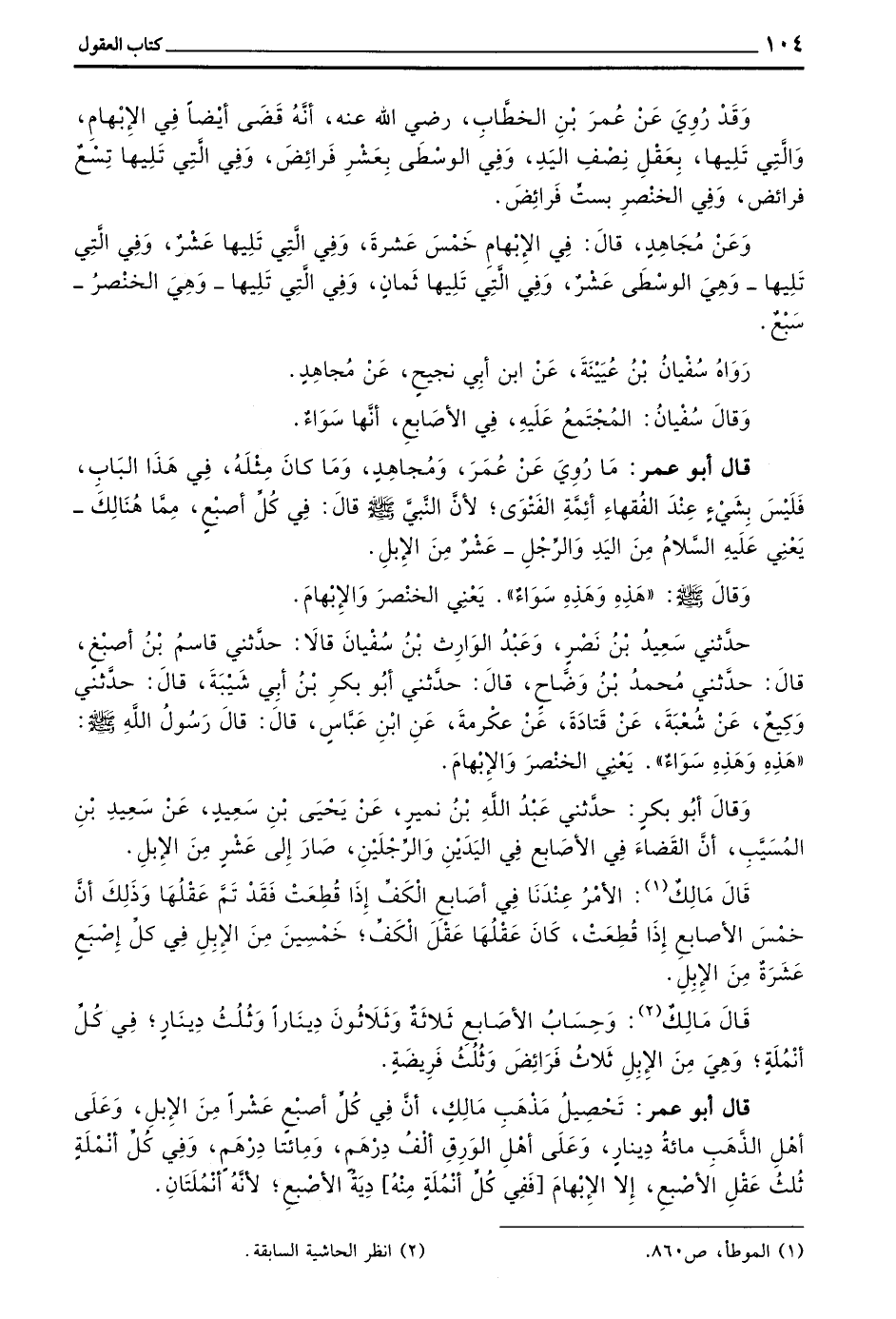 قَالَ أَبُو عُمَرَ تَحْصِيلُ مَذْهَبِ مَالِكٍ أَنَّ فِي كُلِّ أُصْبُعٍ عَشْرًا مِنَ الْإِبِلِ وَعَلَى أَهْلِ الذَّهَبِ مِائَةُ دِينَارٍ وَعَلَى أَهْلِ الْوَرِقِ أَلْفُ دِرْهَمٍ وَمِائَتَا دِرْهَمٍ وَفِي كُلِّ أُنْمُلَةٍ ثُلُثُ عَقْلِ الْأُصْبُعِ إِلَّا الْإِبْهَامَ فَفِي كُلِّ أُنْمُلَةٍ مِنْهُ دِيَةُ الْإِصْبَعِ لِأَنَّهُ أَنُمْلَتَانِ