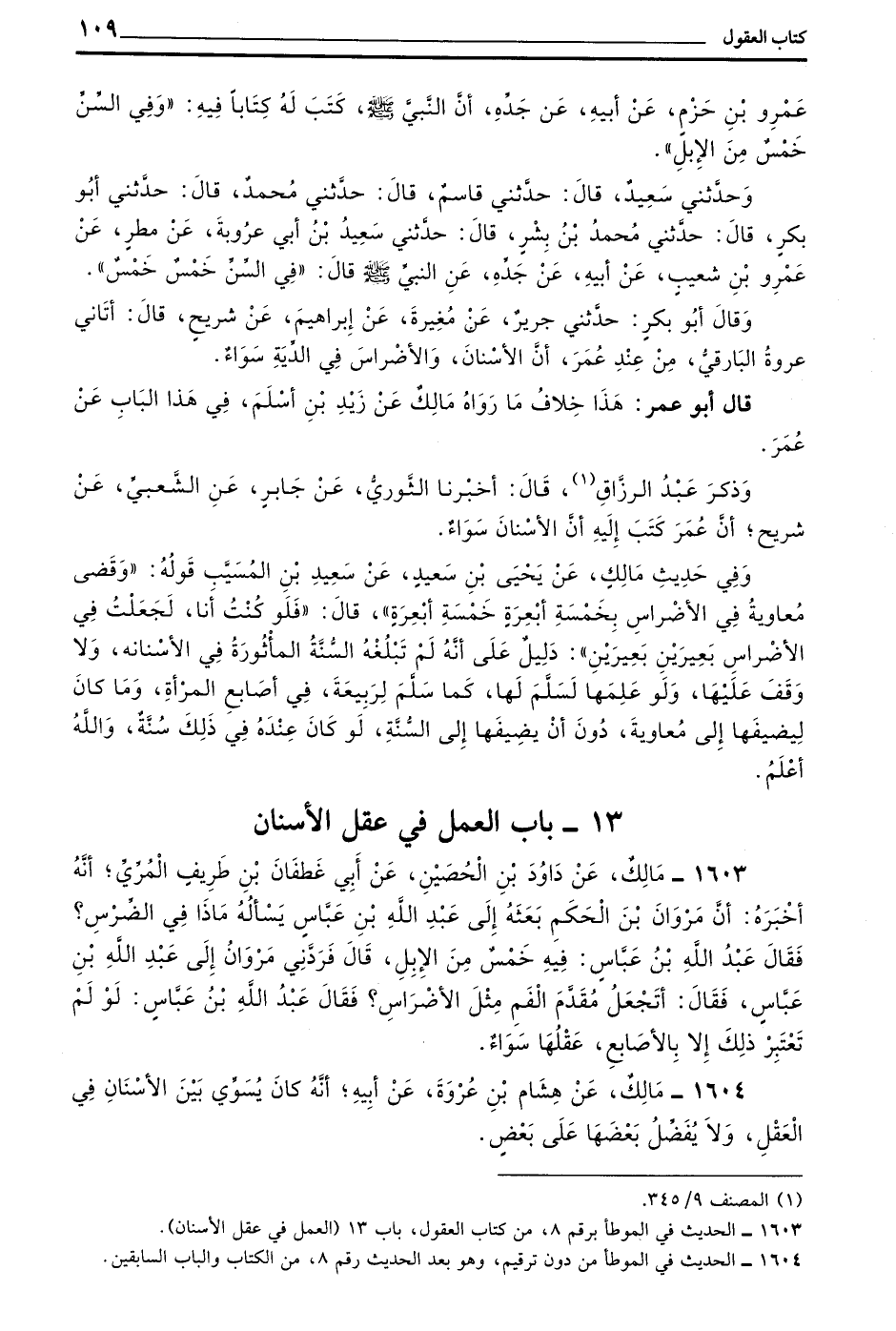1604 - مَالِكٌ عَنْ هِشَامِ بْنِ عُرْوَةَ عَنْ أَبِيهِ أَنَّهُ كَانَ يُسَوِّي بَيْنَ الْأَسْنَانِ فِي الْعَقْلِ وَلَا يُفَضِّلُ بَعْضَهَا عَلَى بَعْضٍ