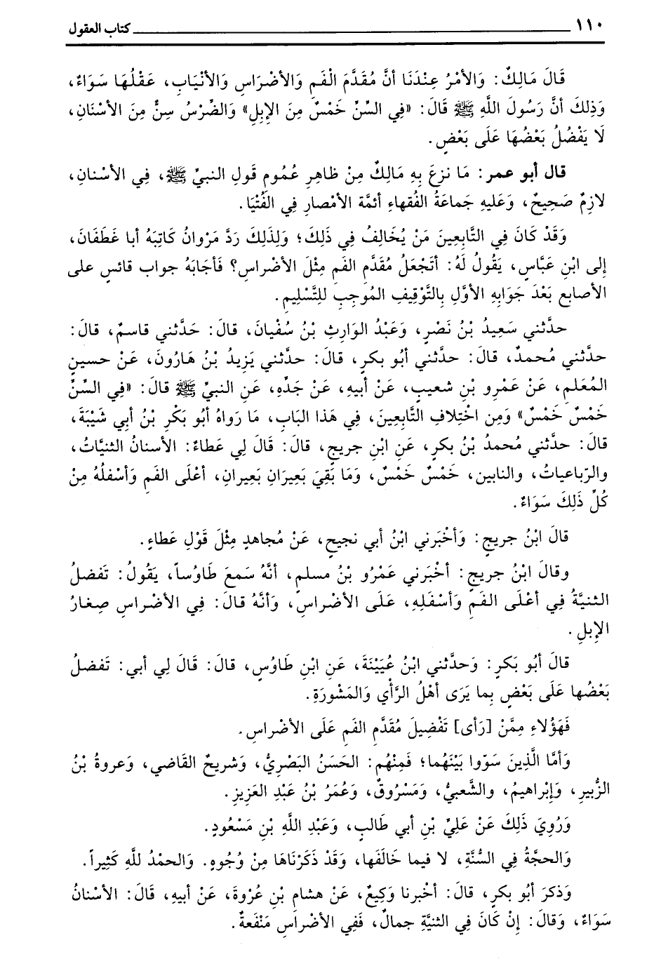 حَدَّثَنِي سَعِيدُ بْنُ نَصْرٍ وَعَبْدُ الْوَارِثِ بْنُ سُفْيَانَ قَالَ حَدَّثَنِي قَاسِمٌ قَالَ حَدَّثَنِي مُحَمَّدٌ قَالَ حَدَّثَنِي أَبُو بَكْرٍ قَالَ حَدَّثَنِي يَزِيدُ بْنُ هَارُونَ عَنْ حُسَيْنٍ الْمُعَلِّمُ عَنْ عَمْرِو بْنِ شُعَيْبٍ عَنْ أَبِيهِ عَنْ جَدِّهِ عَنِ النَّبِيِّ صَلَّى اللَّهُ عَلَيْهِ وَسَلَّمَ قَالَ فِي السِّنِّ خَمْسٌ خَمْسٌ وَمِنَ اخْتِلَافِ التَّابِعِينَ فِي هَذَا الْبَابِ مَا رَوَاهُ أَبُو بَكْرِ بْنُ أَبِي شَيْبَةَ قَالَ حَدَّثَنِي محمد بن بكر عن بن جُرَيْجٍ قَالَ قَالَ لِي عَطَاءٌ الْأَسْنَانُ الثَّنِيَّاتُ والرباعيات والنابين خمس خَمْسٌ وَمَا بَقِيَ بَعِيرَانِ بَعِيرَانِ أَعْلَى الْفَمِ وأسفله من كل ذلك سواء