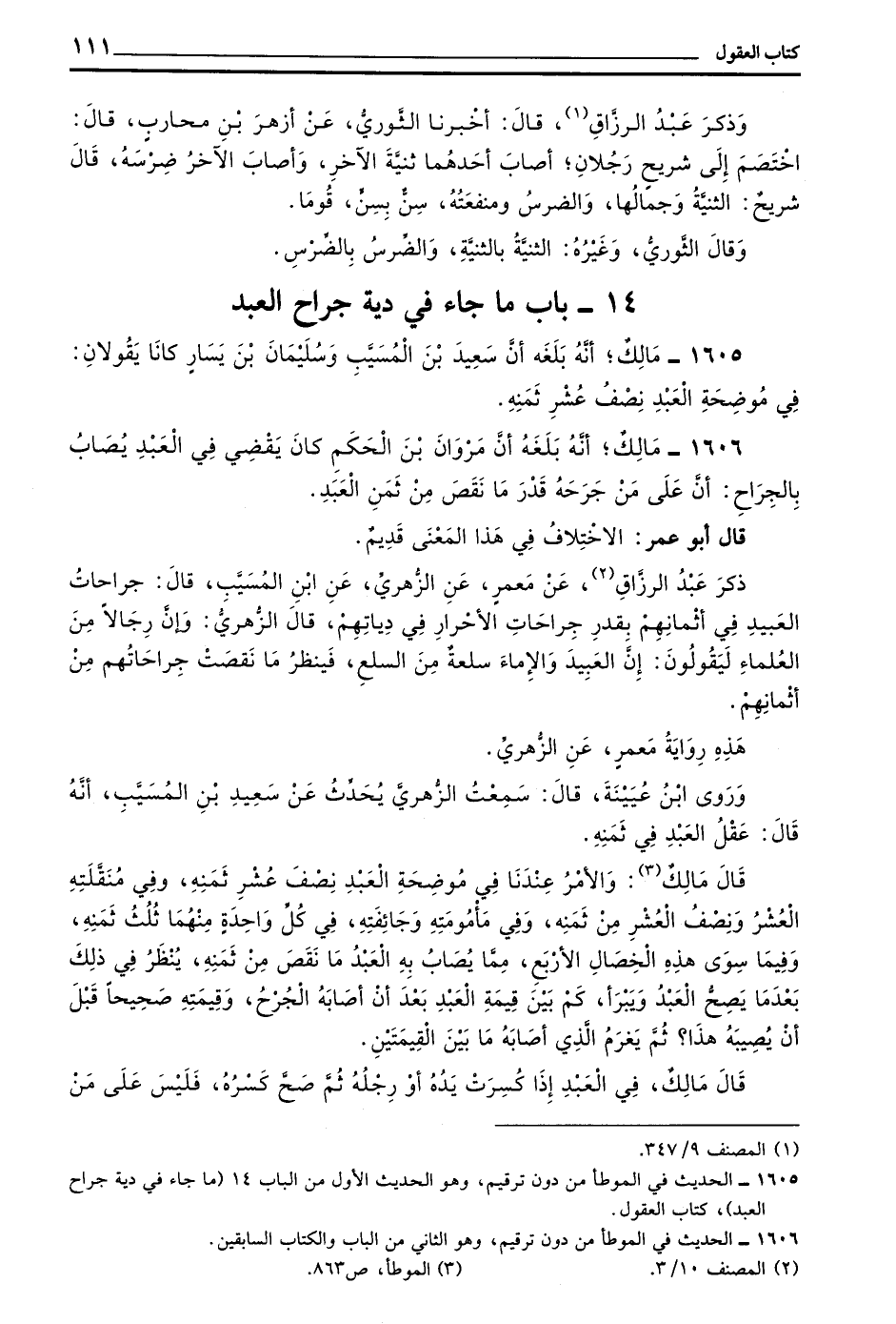 ذَكَرَ عَبْدُ الرَّزَّاقِ عَنْ مَعْمَرٍ عَنِ الزُّهْرِيِّ عن بن الْمُسَيَّبِ قَالَ جِرَاحَاتُ الْعَبِيدِ فِي أَثْمَانِهِمْ بِقَدْرِ جِرَاحَاتِ الْأَحْرَارِ فِي دِيَاتِهِمْ قَالَ الزُّهْرِيُّ وَإِنَّ رِجَالًا مِنَ الْعُلَمَاءِ لَيَقُولُونَ إِنَّ الْعَبِيدَ وَالْإِمَاءَ سِلْعَةٌ مِنَ السِّلَعِ فَيَنْظُرُ مَا نَقَصَتْ جِرَاحَاتُهُمْ مِنْ أَثْمَانِهِمْ