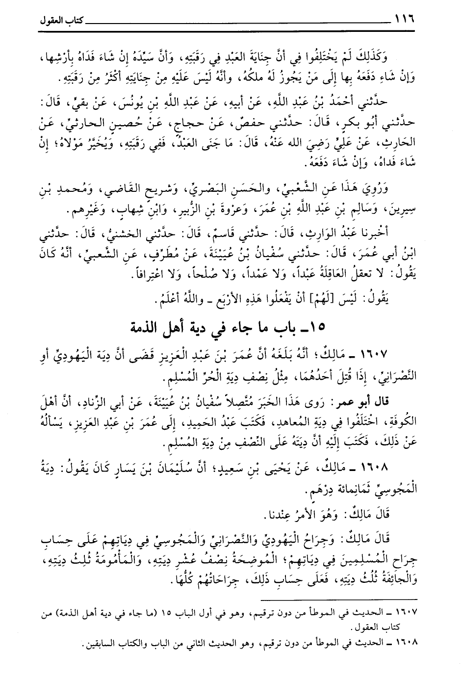 1607 - مَالِكٌ أَنَّهُ بَلَغَهُ أَنَّ عُمَرَ بْنَ عَبْدِ الْعَزِيزِ قَضَى أَنَّ دِيَةَ الْيَهُودِيِّ أَوِ النَّصْرَانِيِّ إِذَا قُتِلَ أَحَدُهُمَا مِثْلُ نِصْفِ دِيَةِ الْحُرِّ الْمُسْلِمِ