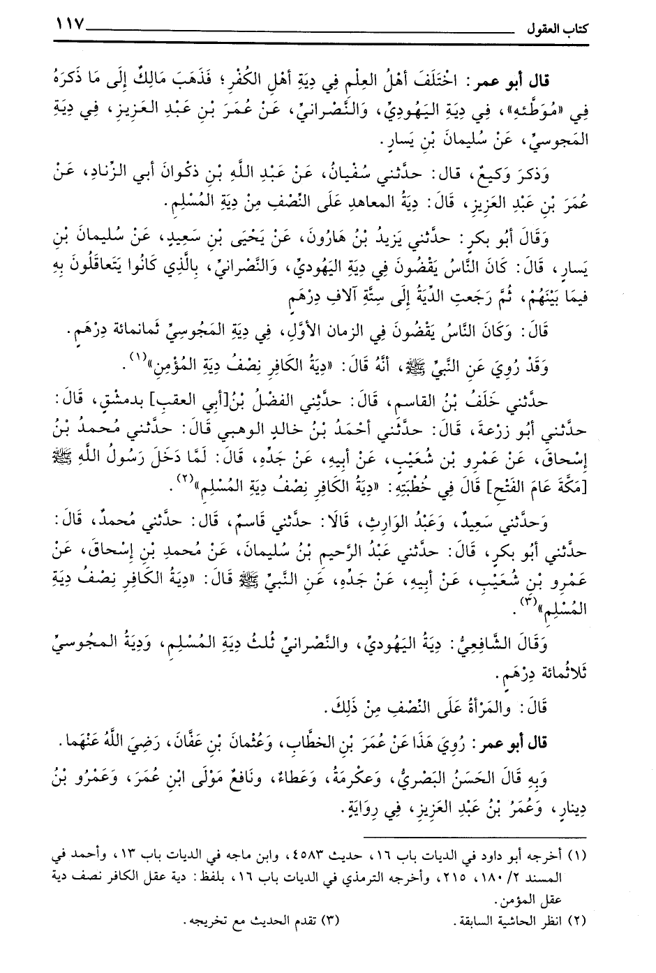 قَالَ أَبُو عُمَرَ اخْتَلَفَ أَهْلُ الْعِلْمِ فِي دِيَةِ أَهْلِ الْكُفْرِ فَذَهَبَ مَالِكٌ إِلَى مَا ذَكَرَهُ فِي مُوَطَّئِهِ فِي دِيَةِ الْيَهُودِيِّ وَالنَّصْرَانِيِّ عَنْ عُمَرَ بْنِ عَبْدِ الْعَزِيزِ فِي دِيَةِ الْمَجُوسِيِّ عَنْ سُلَيْمَانَ بْنِ يَسَارٍ