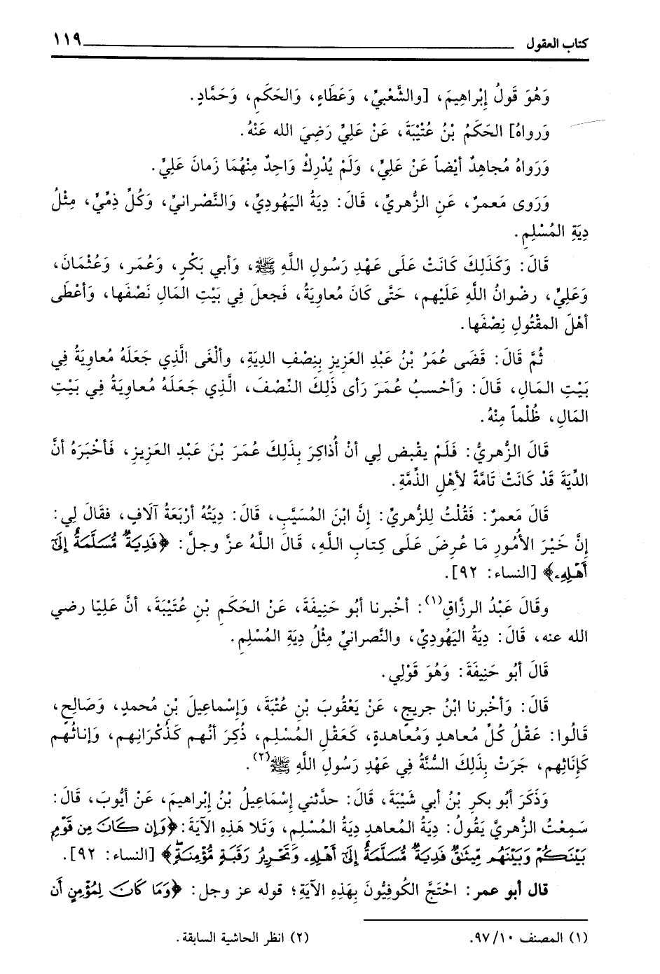 قال وأخبرنا بن جُرَيْجٍ عَنْ يَعْقُوبَ بْنِ عُتْبَةَ وَإِسْمَاعِيلَ بْنِ مُحَمَّدٍ وَصَالِحٍ قَالُوا عَقْلُ كُلِّ مَعَاهَدٍ وَمُعَاهَدَةٍ كعقل المسلم ذكر أنهم كَذُكْرَانِهِمْ وَإِنَاثُهُمْ كَإِنَاثِهِمْ جَرَتْ بِذَلِكَ السُّنَّةُ فِي عَهْدِ رَسُولِ اللَّهِ صَلَّى اللَّهُ عَلَيْهِ وَسَلَّمَ