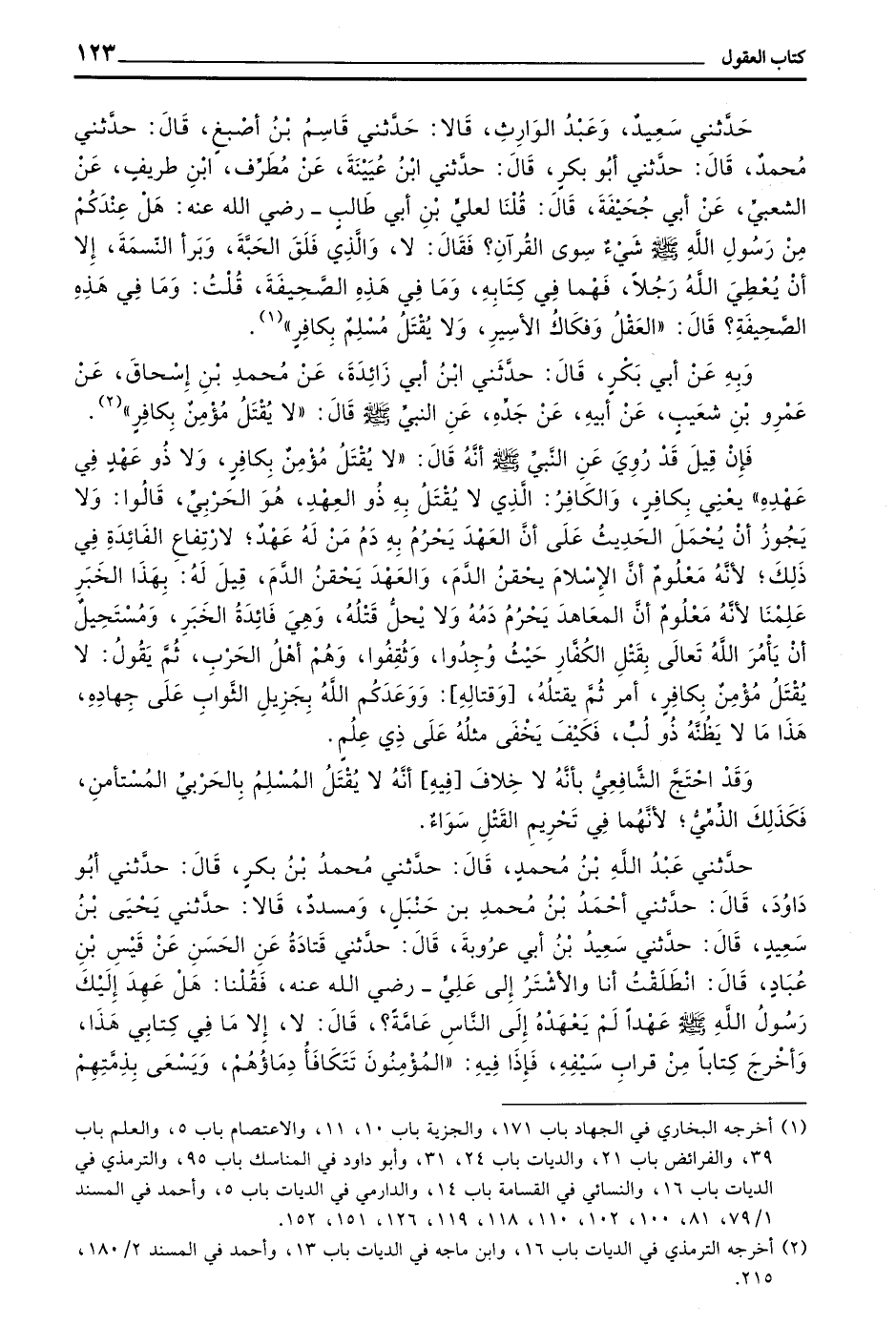 حَدَّثَنِي سَعِيدٌ وَعَبْدُ الْوَارِثِ قَالَا حَدَّثَنِي قَاسِمُ بْنُ أَصْبَغَ قَالَ حَدَّثَنِي مُحَمَّدٌ قَالَ حَدَّثَنِي أَبُو بَكْرٍ قَالَ حَدَّثَنِي بن عُيَيْنَةَ عَنْ مُطَرِّفِ بْنِ طَرِيفٍ عَنِ الشَّعْبِيِّ عَنْ أَبِي جُحَيْفَةَ قَالَ قُلْنَا لِعَلِيِّ بْنِ أَبِي طَالِبٍ - رَضِيَ اللَّهُ عَنْهُ هَلْ عِنْدَكُمْ مِنْ رَسُولِ اللَّهِ صَلَّى اللَّهُ عَلَيْهِ وَسَلَّمَ شَيْءٌ سِوَى الْقُرْآنِ فَقَالَ لَا وَالَّذِي فَلَقَ الْحَبَّةَ وَبَرَأَ النَّسَمَةَ إِلَّا أَنْ يُعْطِيَ اللَّهُ رَجُلًا فَهْمًا فِي كِتَابِهِ وَمَا فِي هَذِهِ الصَّحِيفَةِ قُلْتُ وَمَا فِي هَذِهِ الصَّحِيفَةِ قَالَ الْعَقْلُ وَفِكَاكُ الْأَسِيرِ وَلَا يُقْتَلُ مُسْلِمٌ بِكَافِرٍ