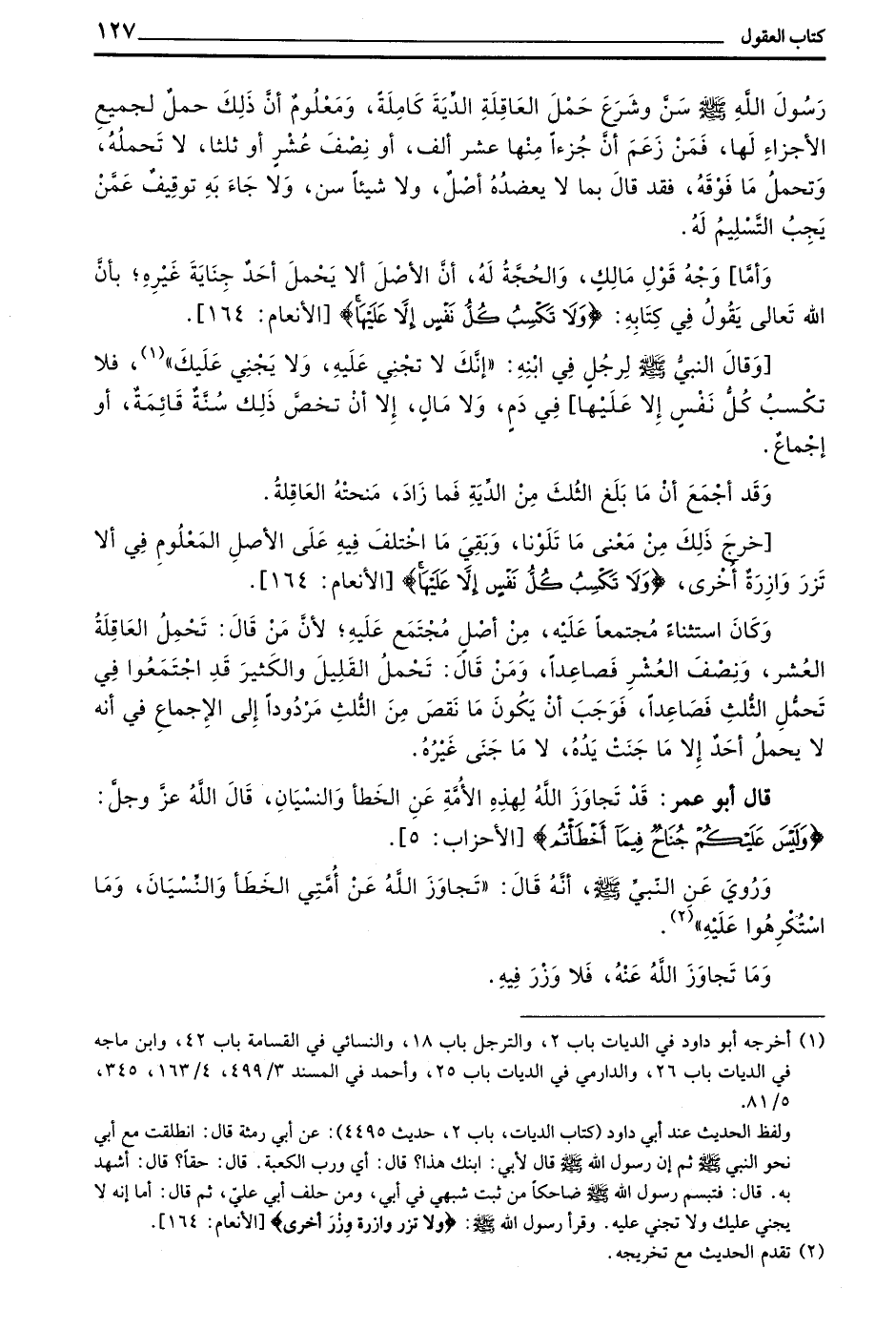 رَسُولَ اللَّهِ صَلَّى اللَّهُ عَلَيْهِ وَسَلَّمَ سَنَّ وَشَرَعَ حَمْلَ الْعَاقِلَةِ الدِّيَةَ كَامِلَةً وَمَعْلُومٌ أَنَّ ذَلِكَ حَمْلٌ لِجَمِيعِ الْأَجْزَاءِ لَهَا فَمَنْ زَعَمَ أَنَّ جُزْءًا مِنْهَا عُشْرَ أَلْفٍ أَوْ نِصْفَ عُشْرٍ أَوْ ثُلُثًا لَا تَحْمِلُهُ وَتَحْمِلُ مَا فَوْقَهُ فَقَدْ قَالَ بِمَا لَا يُعَضِّدُهُ أَصْلٌ وَلَا شَيْئًا سُنَّ وَلَا جَاءَ بِهِ تَوْقِيفٌ عَمَّنْ يَجِبُ التَّسْلِيمُ لَهُ