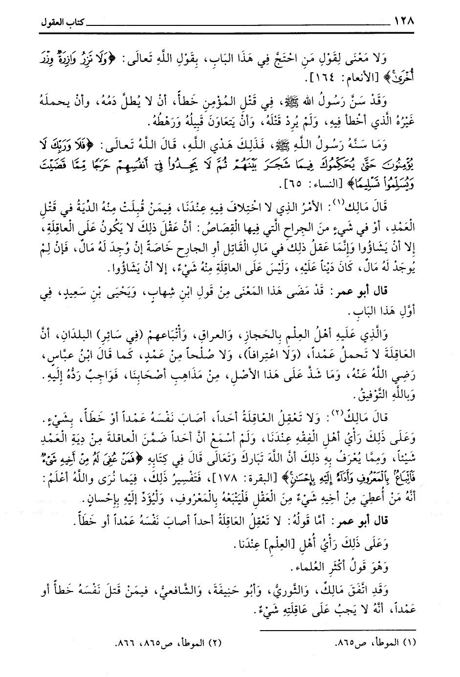 وَعَلَى ذَلِكَ رَأْيُ أَهْلِ الْفِقْهِ عِنْدَنَا وَلَمْ أَسْمَعْ أَنَّ أَحَدًا ضَمَّنَ الْعَاقِلَةَ مِنْ دِيَةِ الْعَمْدِ شَيْئًا وَمِمَّا يُعْرَفُ بِهِ ذَلِكَ أَنَّ اللَّهَ تَبَارَكَ وَتَعَالَى قَالَ فِي كِتَابِهِ (فَمَنْ عُفِيَ لَهُ مِنْ أَخِيهِ شَيْءٌ فَاتِّبَاعٌ بالمعروف وأداء إليه بإحسن) الْبَقَرَةِ 178 فَتَفْسِيرُ ذَلِكَ فِيمَا نَرَى وَاللَّهُ أَعْلَمُ أَنَّهُ مَنْ أُعْطِيَ مِنْ أَخِيهِ شَيْءٌ مِنَ الْعَقْلِ فَلْيَتْبَعْهُ بِالْمَعْرُوفِ وَلْيُؤَدِّ إِلَيْهِ بِإِحْسَانٍ