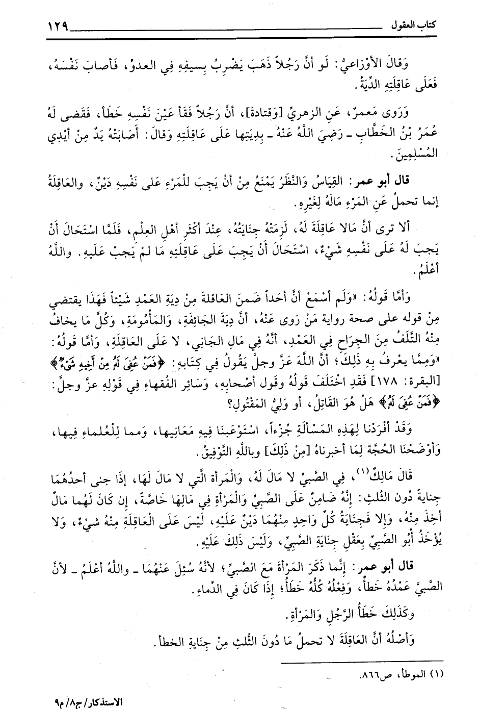 قَالَ أَبُو عُمَرَ الْقِيَاسُ وَالنَّظَرُ يَمْنَعُ مِنْ أَنْ يَجِبَ لِلْمَرْءِ عَلَى نَفْسِهِ دَيْنٌ وَالْعَاقِلَةُ إِنَّمَا تَحْمِلُ عَنِ الْمَرْءِ مَالَهُ لِغَيْرِهِ