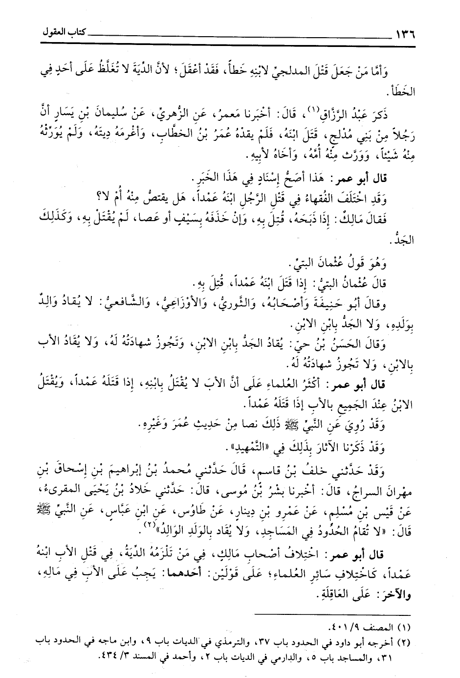 قَالَ أَبُو عُمَرَ أَكْثَرُ الْعُلَمَاءِ عَلَى أَنَّ الْأَبَ لَا يُقْتَلُ بِابْنِهِ إِذَا قَتَلَهُ عَمْدًا وَيُقْتَلُ الِابْنُ عِنْدَ الْجَمِيعِ بِالْأَبِ إِذَا قَتَلَهُ عَمْدًا