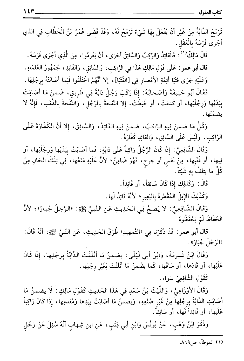 قَالَ أَبُو عُمَرَ عَلَى قَوْلِ مَالِكٍ هَذَا فِي الرَّاكِبِ وَالسَّائِقِ وَالْقَائِدِ جُمْهُورُ الْعُلَمَاءِ