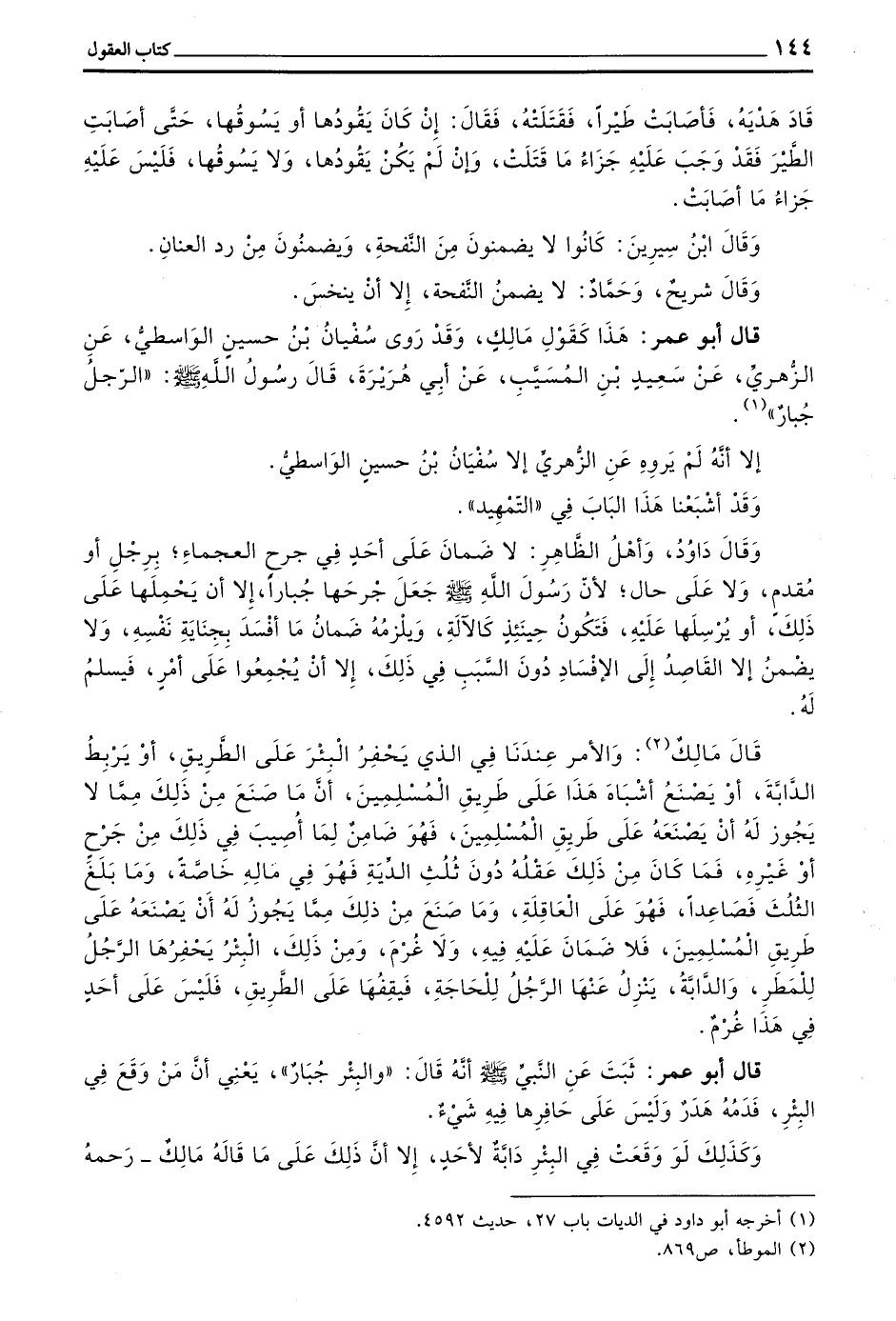 قَالَ أَبُو عُمَرَ ثَبَتَ عَنِ النَّبِيِّ صَلَّى اللَّهُ عَلَيْهِ وَسَلَّمَ أَنَّهُ قَالَ وَالْبِئْرُ جُبَارٌ يَعْنِي أَنَّ مَنْ وَقَعَ فِي الْبِئْرِ فَدَمُهُ هَدْرٌ وَلَيْسَ عَلَى حَافِرِهَا فِيهِ شَيْءٌ