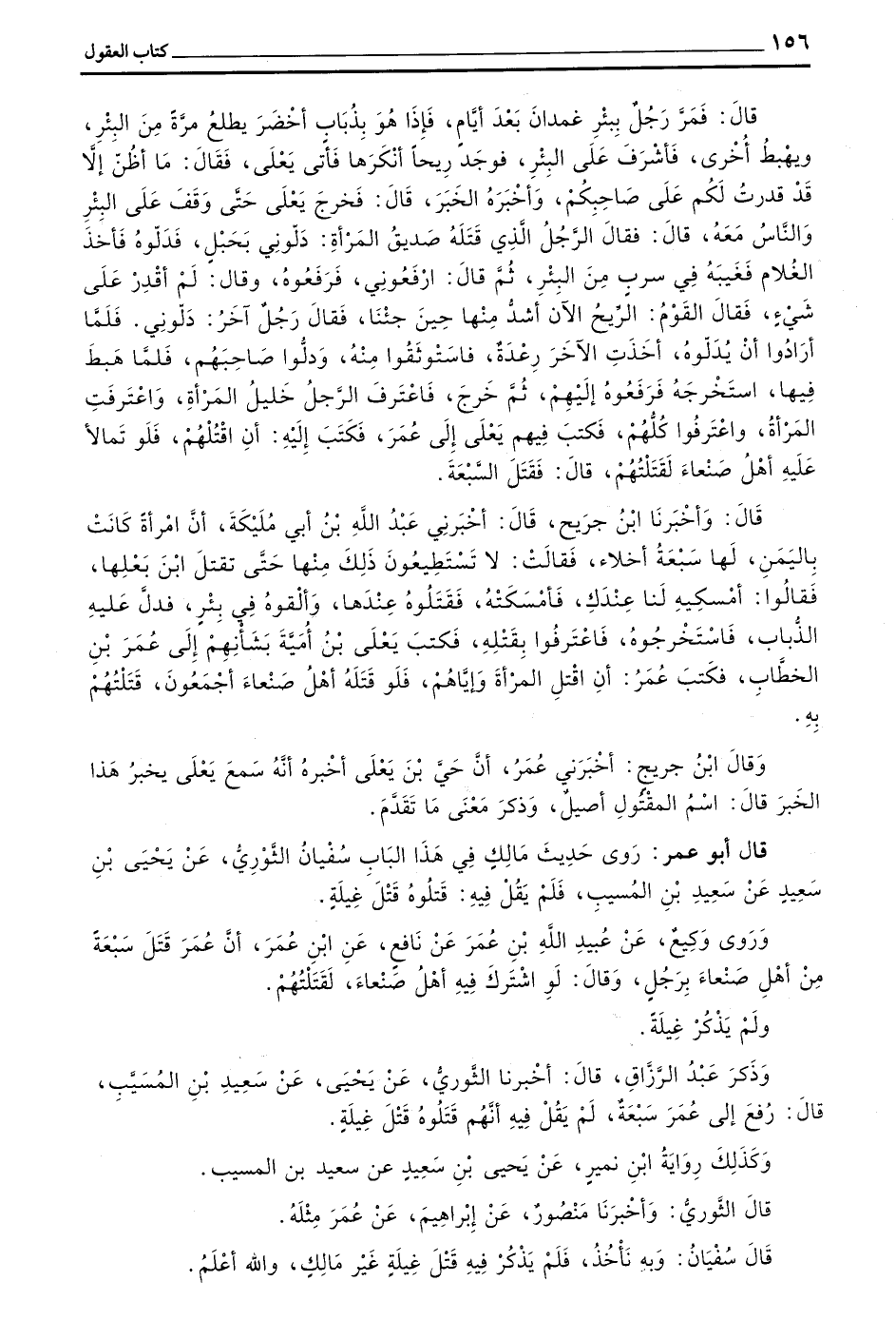 فَلَمَّا أَرَادُوا أَنْ يُدَلُّوهُ أَخَذَتِ الْآخَرَ رِعْدَةٌ فَاسْتَوْثَقُوا مِنْهُ وَدَلُّوا صَاحِبَهُمْ فَلَمَّا هَبَطَ فِيهَا اسْتَخْرَجَهُ فَرَفَعُوهُ إِلَيْهِمْ ثُمَّ خَرَجَ فَاعْتَرَفَ الرَّجُلُ خَلِيلُ الْمَرْأَةِ وَاعْتَرَفَتِ الْمَرْأَةُ وَاعْتَرَفُوا كُلُّهُمْ فَكَتَبَ فِيهِمْ يَعْلَى إِلَى عُمَرَ فَكَتَبَ إِلَيْهِ أَنِ اقْتُلْهُمْ فلو تمالأ عليه أَهْلُ صَنْعَاءَ لَقَتَلْتُهُمْ قَالَ فَقَتَلَ السَّبْعَةَ