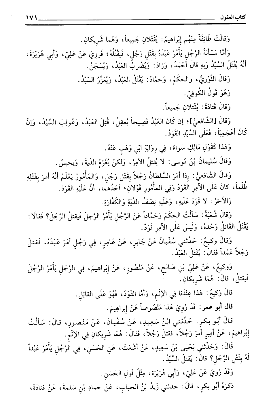 قال أبو بكر حدثني بن سَعِيدٍ عَنْ سُفْيَانَ عَنْ مَنْصُورٍ قَالَ سَأَلْتُ إِبْرَاهِيمَ عَنْ أَمِيرٍ أَمَرَ رَجُلًا فَقَتَلَ رَجُلًا فَقَالَ هُمَا شَرِيكَانِ فِي الْإِثْمِ
