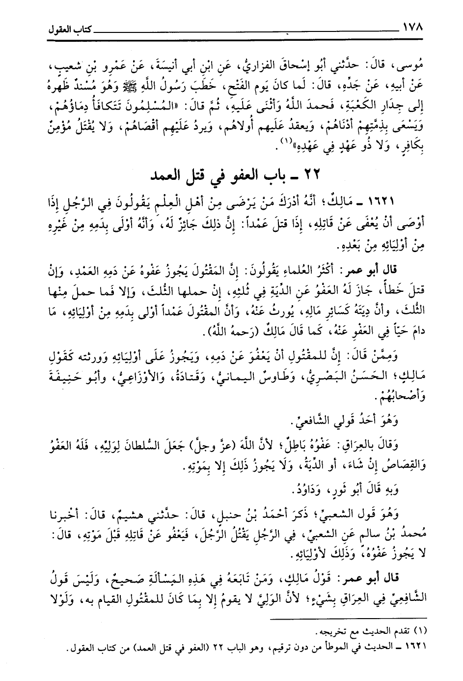 1621 - مَالِكٌ أَنَّهُ أَدْرَكَ مَنْ يَرْضَى مِنْ أَهْلِ الْعِلْمِ يَقُولُونَ فِي الرَّجُلِ إِذَا أَوْصَى أَنْ يُعْفَى عَنْ قَاتِلِهِ إِذَا قَتَلَ عَمْدًا إِنَّ ذَلِكَ جَائِزٌ لَهُ وَأَنَّهُ أَوْلَى بِدَمِهِ مِنْ غَيْرِهِ مِنْ أَوْلِيَائِهِ مِنْ بَعْدِهِ