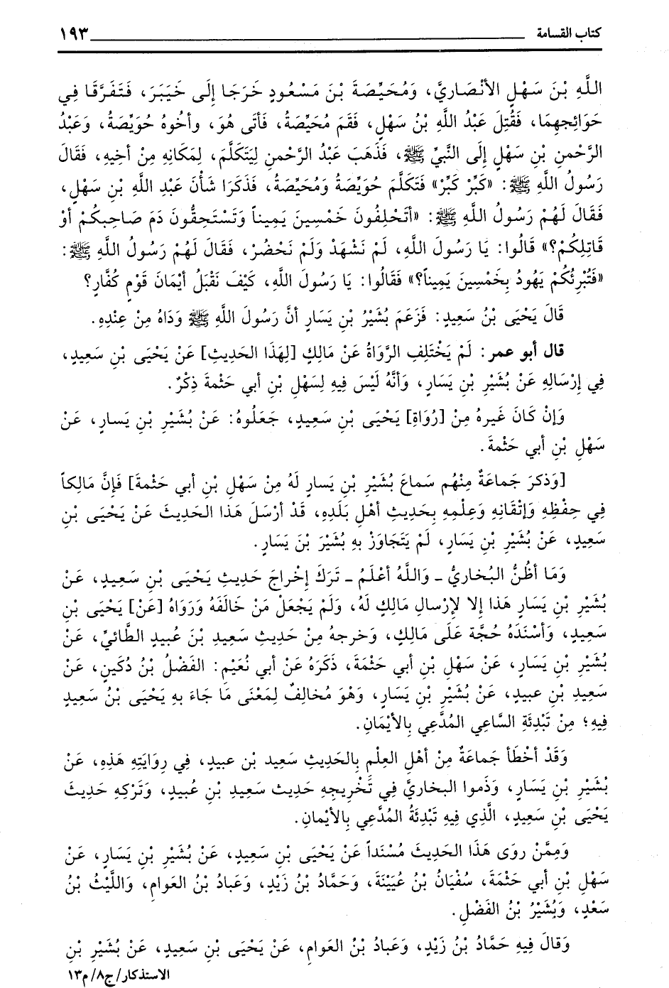وَذَكَرَ جَمَاعَةٌ مِنْهُمْ سَمَاعَ بُشَيْرِ بْنِ يَسَارٍ لَهُ مِنْ سَهْلِ بْنِ أَبِي حَثْمَةَ فَإِنَّ مَالِكًا فِي حِفْظِهِ وَإِتْقَانِهِ وَعِلْمِهِ بِحَدِيثِ أَهْلِ بَلَدِهِ قَدْ أَرْسَلَ هَذَا الْحَدِيثِ عَنْ يَحْيَى بْنِ سَعِيدٍ عَنْ بَشِيرِ بْنِ يَسَارٍ لَمْ يَتَجَاوَزْ بِهِ بُشَيْرَ بْنَ يَسَارٍ