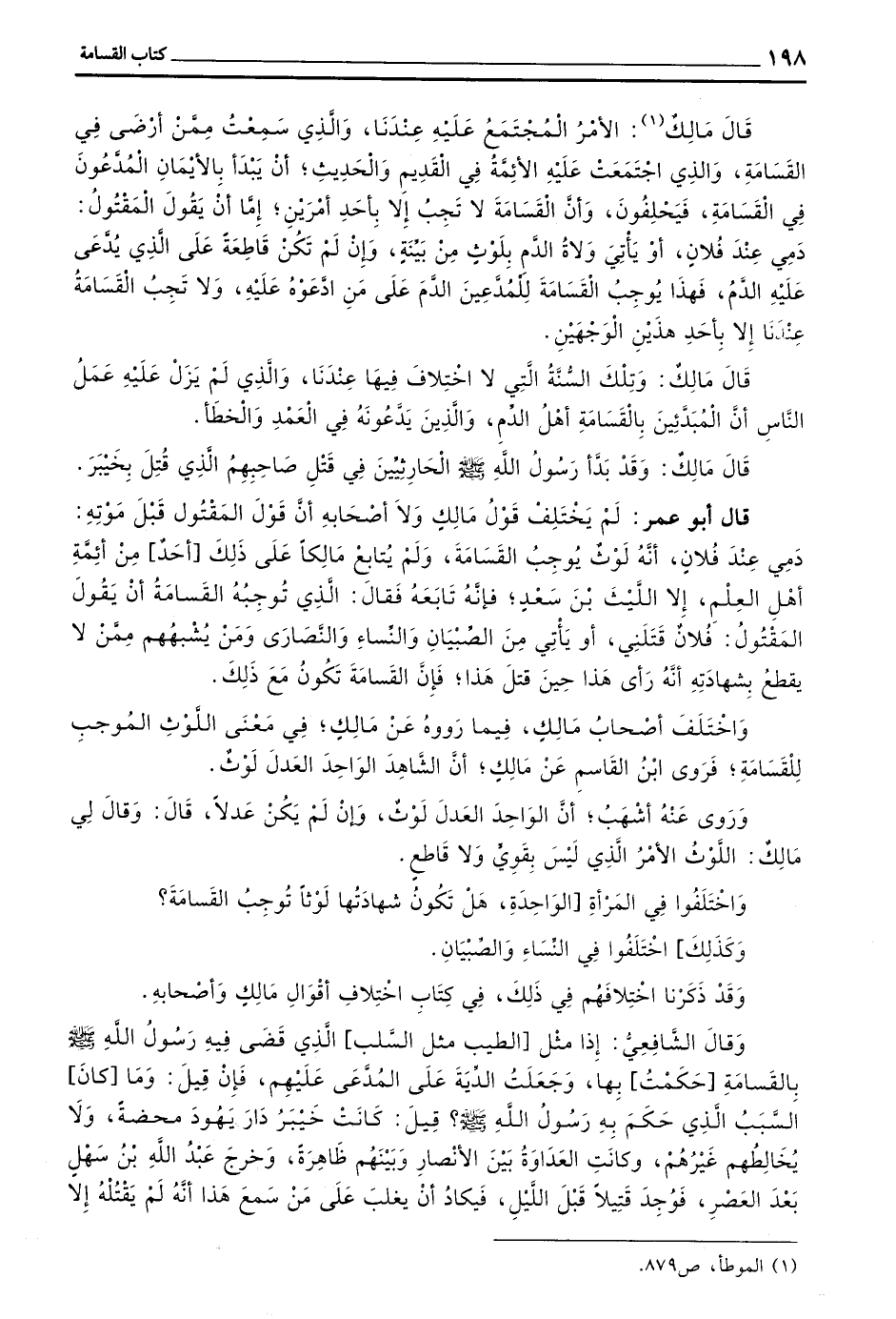 قَالَ مَالِكٌ وَتِلْكَ السُّنَّةُ الَّتِي لَا اخْتِلَافَ فِيهَا عِنْدَنَا وَالَّذِي لَمْ يَزَلْ عَلَيْهِ عَمَلُ النَّاسِ أَنَّ الْمُبَدَّئِينَ بِالْقَسَامَةِ أَهْلُ الدَّمِ وَالَّذِينَ يَدَّعُونَهُ فِي الْعَمْدِ وَالْخَطَأِ