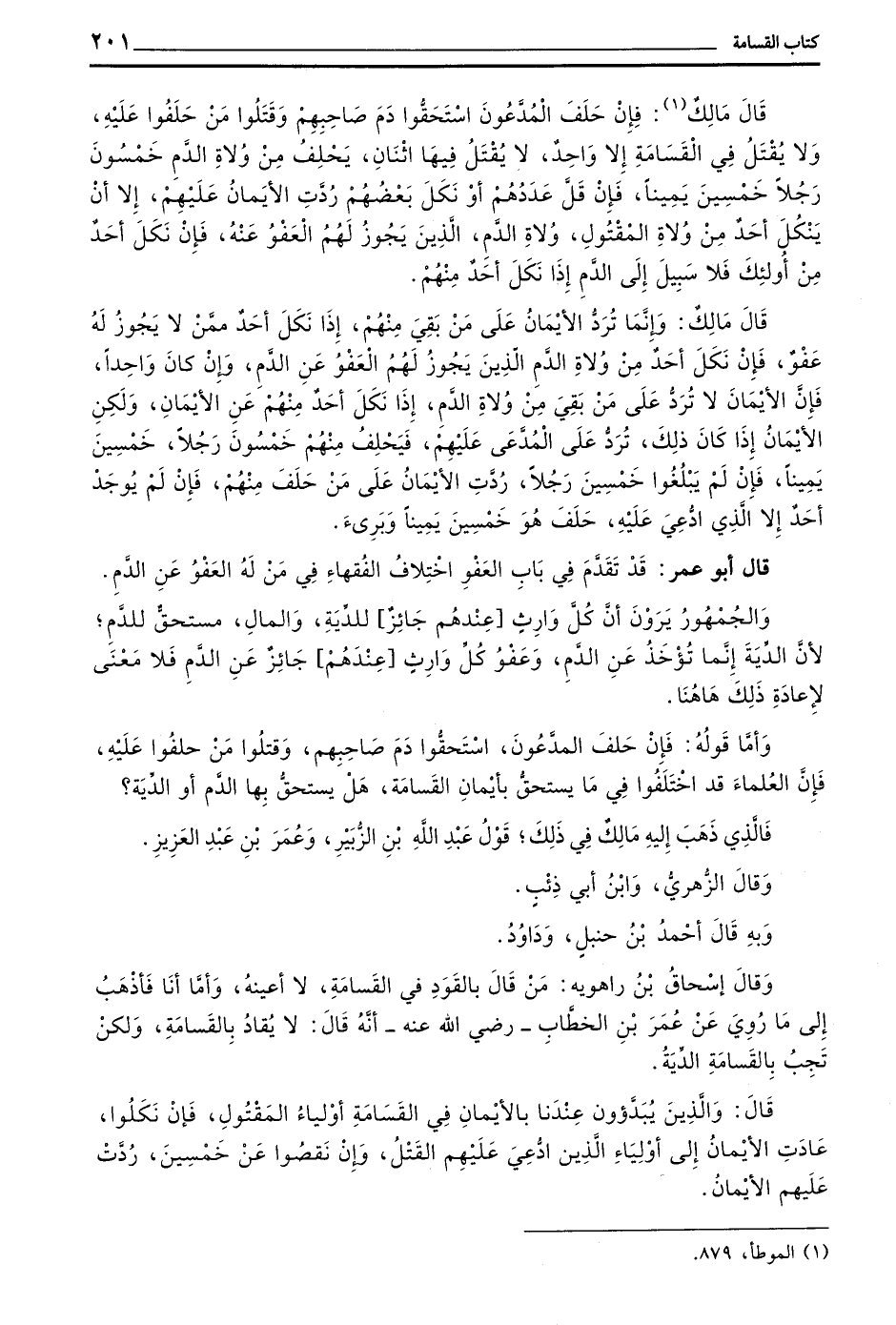 قَالَ مَالِكٌ فَإِنْ حَلَفَ الْمُدَّعُونَ اسْتَحَقُّوا دَمَ صَاحِبِهِمْ وَقَتَلُوا مَنْ حَلَفُوا عَلَيْهِ وَلَا يُقْتَلُ فِي الْقَسَامَةِ إِلَّا وَاحِدٌ لَا يُقْتَلُ فِيهَا اثْنَانِ يَحْلِفُ مِنْ وُلَاةِ الدَّمِ خَمْسُونَ رَجُلًا خَمْسِينَ يَمِينًا فَإِنَّ قَلَّ عَدَدُهُمْ أَوْ نَكَلَ بَعْضُهُمْ رُدَّتِ الْأَيْمَانُ عَلَيْهِمْ إِلَّا أَنْ يَنْكُلَ أَحَدٌ مِنْ وُلَاةِ الْمَقْتُولِ وُلَاةِ الدَّمِ الَّذِينَ يَجُوزُ لَهُمُ الْعَفْوُ عَنْهُ فَإِنْ نَكَلَ أَحَدٌ مِنْ أُولَئِكَ فَلَا سَبِيلَ إِلَى الدَّمِ إِذَا نَكَلَ أَحَدٌ مِنْهُمْ