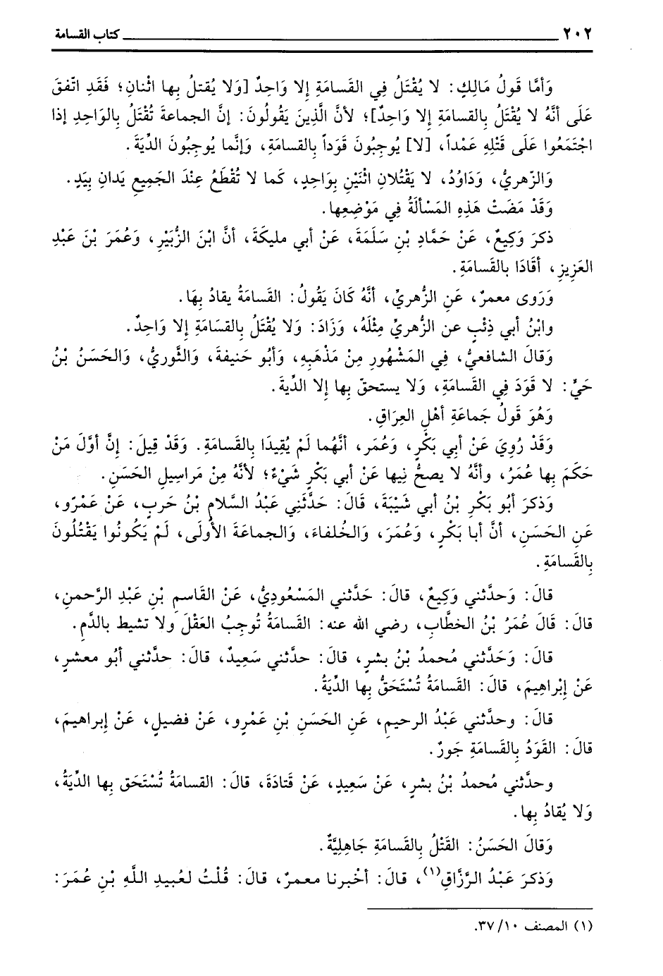 وَذَكَرَ أَبُو بَكْرِ بْنُ أَبِي شَيْبَةَ قَالَ حَدَّثَنِي عَبْدُ السَّلَامِ بْنُ حَرْبٍ عَنْ عَمْرٍو عَنِ الْحَسَنِ أَنَّ أَبَا بَكْرٍ وَعُمَرَ وَالْخُلَفَاءَ وَالْجَمَاعَةَ الْأُولَى لَمْ يَكُونُوا يَقْتُلُونَ بِالْقَسَامَةِ