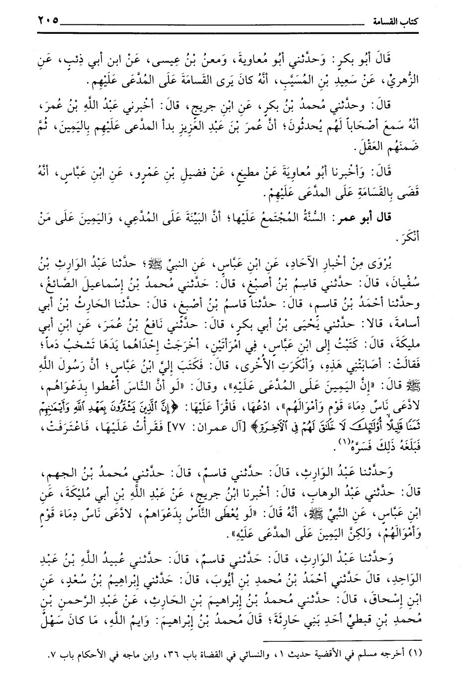 يروى من أخبار الآحاد عن بْنِ عَبَّاسٍ عَنِ النَّبِيِّ صَلَّى اللَّهُ عَلَيْهِ وَسَلَّمَ حَدَّثَنَا عَبْدُ الْوَارِثِ بْنُ سُفْيَانَ قَالَ حَدَّثَنِي قَاسِمُ بْنُ أَصْبَغَ قَالَ حَدَّثَنِي مُحَمَّدُ بْنُ إِسْمَاعِيلَ الصَّائِغُ وَحَدَّثَنَا أَحْمَدُ بْنُ قَاسِمٍ قَالَ حَدَّثَنَا قَاسِمُ بْنُ أَصْبَغَ قَالَ حَدَّثَنَا الْحَارِثُ بْنُ أَبِي أُسَامَةَ قَالَا حَدَّثَنِي يَحْيَى بْنُ أَبِي بَكْرٍ قَالَ حَدَّثَنِي نَافِعُ بْنُ عُمَرَ عن بن أبي مليكة قال كتبت إلى بن عَبَّاسٍ فِي امْرَأَتَيْنِ أَخْرَجَتْ إِحْدَاهُمَا يَدَهَا تَشْخُبُ دَمًا فَقَالَتْ أَصَابَتْنِي هَذِهِ وَأَنْكَرَتِ الْأُخْرَى قَالَ فكتب إلى بْنِ عَبَّاسٍ أَنَّ رَسُولَ اللَّهِ صَلَّى اللَّهُ عَلَيْهِ وَسَلَّمَ قَالَ أَنَّ الْيَمِينَ عَلَى الْمُدَّعَى عَلَيْهِ وَقَالَ لَوْ أَنَّ النَّاسَ أُعْطُوا بِدَعْوَاهُمْ لَادَّعَى نَاسٌ دِمَاءَ قَوْمٍ وَأَمْوَالَهُمْ ادْعُهَا فَاقْرَأْ عَلَيْهَا (إن الذين يشترون بعهد الله وأيمنهم ثمنا قليلا أولئك لا خلق لَهُمْ فِي الْآخِرَةِ) آلِ عِمْرَانَ 77 فَقَرَأْتُ عَلَيْهَا فَاعْتَرَفَتْ فَبَلَغَهُ ذَلِكَ فَسَرَّهُ