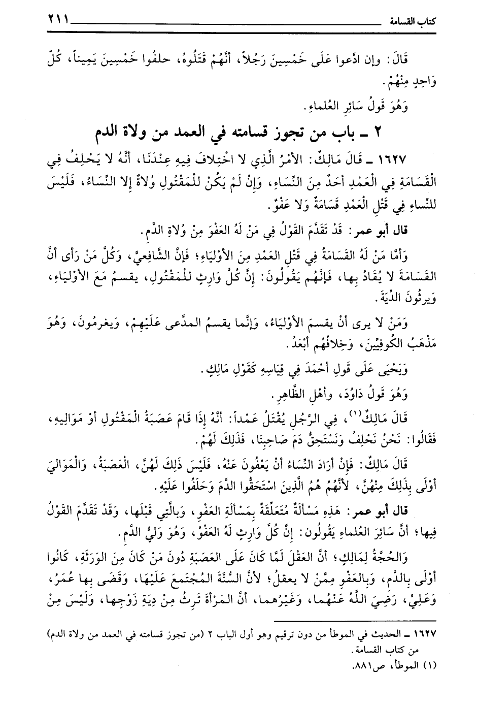 1627 - قَالَ مَالِكٌ الْأَمْرُ الَّذِي لَا اخْتِلَافَ فِيهِ عِنْدَنَا أَنَّهُ لَا يَحْلِفُ فِي الْقَسَامَةِ فِي الْعَمْدِ أَحَدٌ مِنَ النِّسَاءِ وَإِنْ لَمْ يَكُنْ لِلْمَقْتُولِ وُلَاةٌ إِلَّا النِّسَاءُ فَلَيْسَ لِلنِّسَاءِ فِي قَتْلِ الْعَمْدِ قَسَامَةٌ وَلَا عَفْوٌ