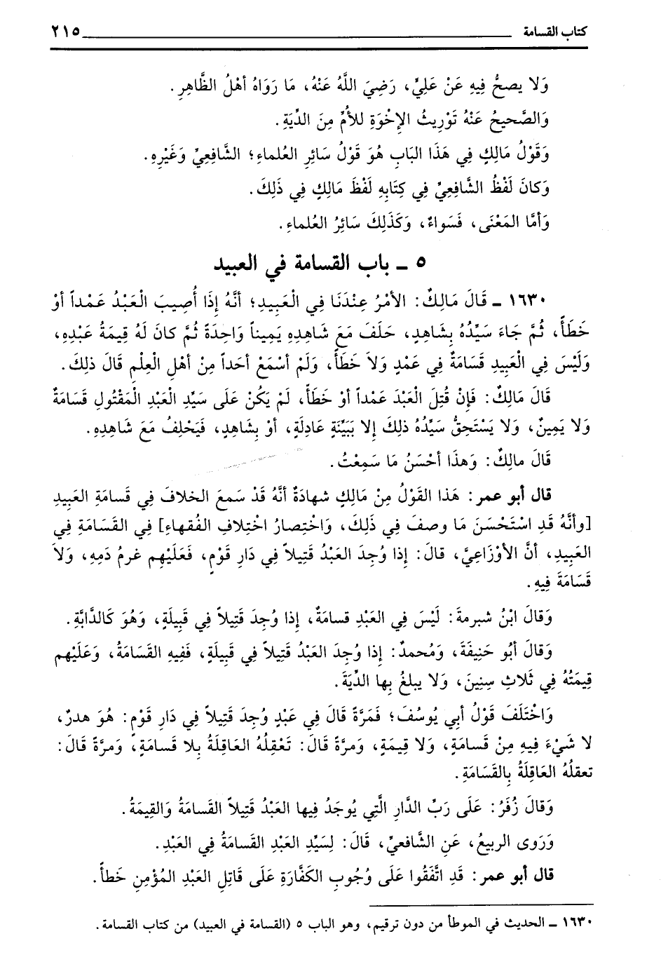 1630 - قَالَ مَالِكٌ الْأَمْرُ عِنْدَنَا فِي الْعَبِيدِ أَنَّهُ إِذَا أُصِيبَ الْعَبْدُ عَمْدًا أَوْ خَطَأً ثُمَّ جَاءَ سَيِّدُهُ بِشَاهِدٍ حَلَفَ مَعَ شَاهِدِهِ يَمِينًا وَاحِدَةً ثُمَّ كَانَ لَهُ قِيمَةُ عَبْدِهِ وَلَيْسَ فِي الْعَبِيدِ قَسَامَةٌ فِي عَمْدٍ وَلَا خَطَأً وَلَمْ أَسْمَعْ أَحَدًا مِنْ أَهْلِ الْعِلْمِ قَالَ ذَلِكَ