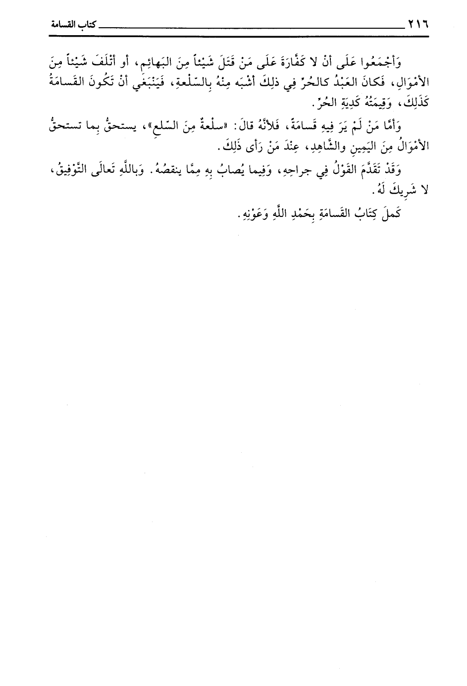وَأَجْمَعُوا عَلَى أَنْ لَا كَفَّارَةَ عَلَى مَنْ قَتَلَ شَيْئًا مِنَ الْبَهَائِمِ أَوْ أَتْلَفَ شَيْئًا مِنَ الْأَمْوَالِ فَكَانَ الْعَبْدُ كَالْحُرِّ فِي ذَلِكَ أَشْبَهَ مِنْهُ بِالسِّلْعَةِ فَيَنْبَغِي أَنْ تَكُونَ الْقَسَامَةُ كَذَلِكَ وَقِيمَتُهُ كَدِيَةِ الْحُرِّ