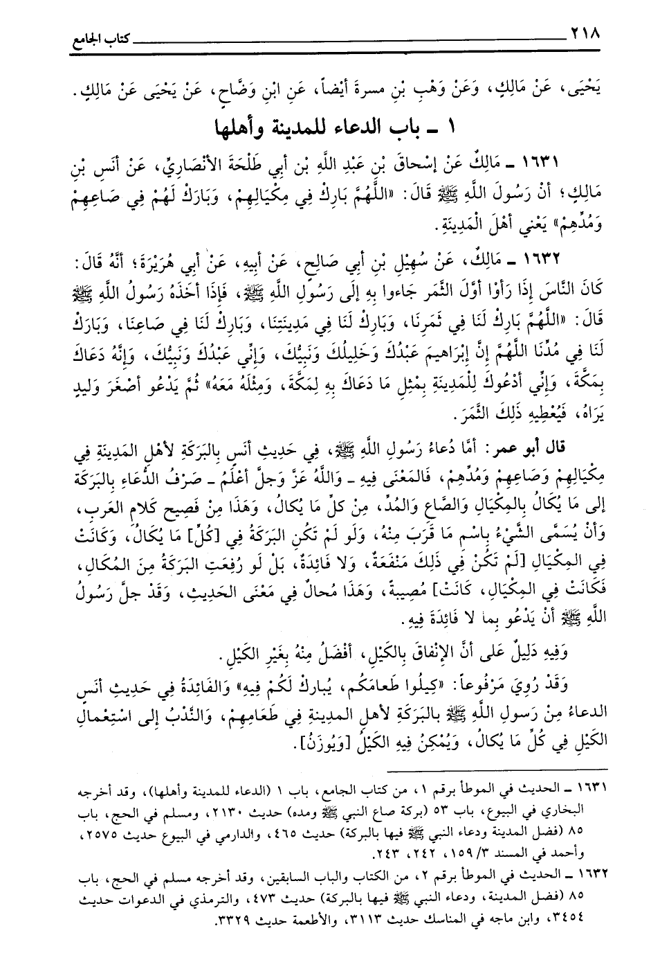 1631 - مَالِكٌ عَنْ إِسْحَاقَ بْنِ عَبْدِ اللَّهِ بْنِ أَبِي طَلْحَةَ الْأَنْصَارِيِّ عَنْ أَنَسِ بْنِ مَالِكٍ أَنَّ رَسُولَ اللَّهِ صَلَّى اللَّهُ عَلَيْهِ وَسَلَّمَ قَالَ اللَّهُمَّ بَارِكْ فِي مِكْيَالِهِمْ وَبَارِكْ لَهُمْ فِي صَاعِهِمْ وَمُدِّهِمْ يَعْنِي أَهْلَ الْمَدِينَةِ
