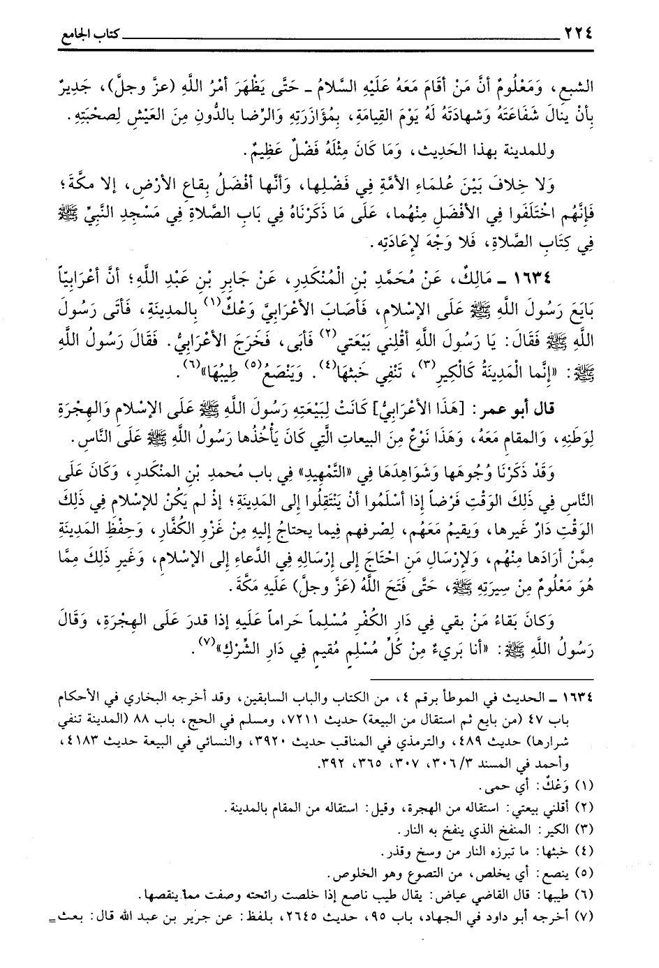 1634 - مَالِكٌ عَنْ مُحَمَّدِ بْنِ الْمُنْكَدِرِ عَنْ جَابِرِ بْنِ عَبْدِ اللَّهِ أَنَّ أَعْرَابِيًّا بَايَعَ رَسُولَ اللَّهِ صَلَّى اللَّهُ عَلَيْهِ وَسَلَّمَ عَلَى الْإِسْلَامِ فَأَصَابَ الْأَعْرَابِيَّ وَعَكٌ بِالْمَدِينَةِ فَأُتِيَ رَسُولُ اللَّهِ صَلَّى اللَّهُ عَلَيْهِ وَسَلَّمَ فَقَالَ يَا رَسُولَ اللَّهِ أَقِلْنِي بَيْعَتِي فَأَبَى فَخَرَجَ الْأَعْرَابِيُّ