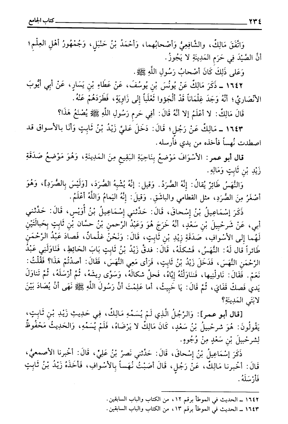 ذَكَرَ إِسْمَاعِيلُ بْنُ إِسْحَاقَ قَالَ حَدَّثَنِي إِسْمَاعِيلُ بْنُ أُوَيْسٍ قَالَ حَدَّثَنِي أَبِي عَنْ شُرَحْبِيلَ بْنِ سَعْدٍ أَنَّهُ خَرَجَ هُوَ وَعَبْدُ الرَّحْمَنِ بْنُ حَسَّانَ بْنِ ثَابِتٍ بِحِبَالَتَيْنِ لَهُمَا إِلَى الْأَسْوَافِ صَدَقَةِ زَيْدِ بْنِ ثَابِتٍ قَالَ وَنَحْنُ غِلْمَانٌ فَصَادَ عَبْدُ الرَّحْمَنِ طَائِرًا قَالَ لَهُ النُّهَسُ فَشَكَلَهُ قَالَ فَدَقَّ زَيْدُ بْنُ ثَابِتٍ بَابَ الْحَائِطِ فَنَاوَلَنِي عَبْدُ الرَّحْمَنِ النِّهَسَ فَدَخَلَ زَيْدُ بْنُ ثَابِتٍ فَرَأَى مَعِي النُّهَسَ فَقَالَ أصدتم هذا فقلت نعم فقال ناولنيها فنناولته إِيَّاهُ فَحَلَّ شِكَالَهُ وَسَوَّى رِيشَهُ ثُمَّ أَرْسَلَهُ ثُمَّ تَنَاوَلَ يَدِي فَصَكَّ قَفَايَ ثُمَّ قَالَ يَا خَبِيثٌ أَمَا عَلِمْتَ أَنَّ رَسُولَ اللَّهِ صَلَّى اللَّهُ عَلَيْهِ وَسَلَّمَ نَهَى أَنْ يُصَادَ بَيْنَ لَابَتَيِ الْمَدِينَةِ