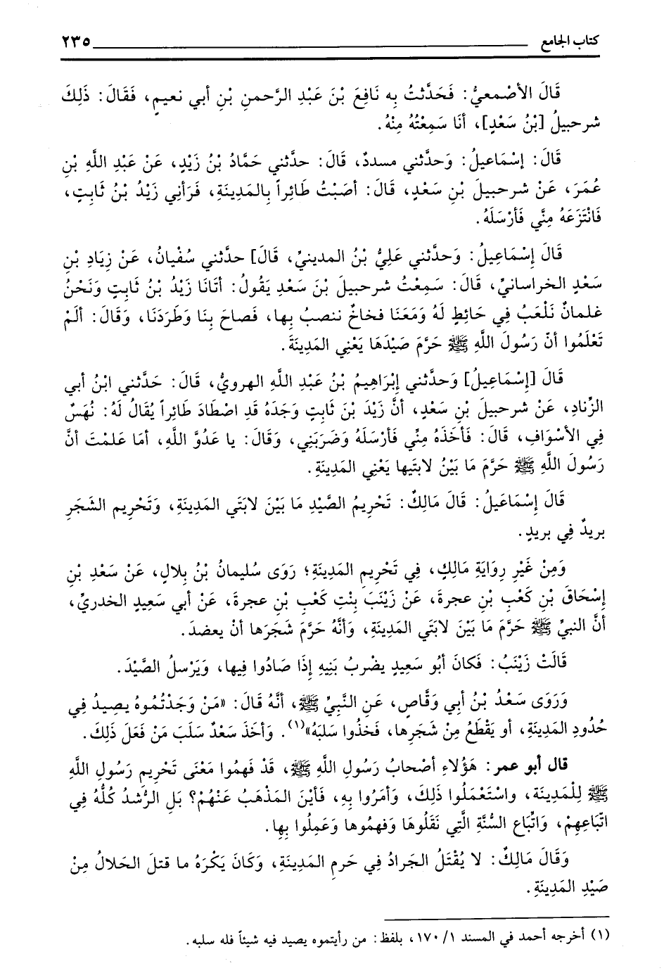 قَالَ إسماعيل وحدثني علي بن الْمَدِينِيِّ قَالَ حَدَّثَنِي سُفْيَانُ عَنْ زِيَادِ بْنِ سعد الخرساني قَالَ سَمِعْتُ شُرَحْبِيلَ بْنَ سَعْدٍ يَقُولُ أَتَانَا زَيْدُ بْنُ ثَابِتٍ وَنَحْنُ غِلْمَانٌ نَلْعَبُ فِي حَائِطٍ لَهُ وَمَعَنَا فِخَاخٌ نَنْصِبُ بِهَا فَصَاحَ بِنَا وَطَرَدَنَا وَقَالَ أَلَمْ تَعْلَمُوا أَنَّ رَسُولَ اللَّهِ صَلَّى اللَّهُ عَلَيْهِ وَسَلَّمَ حَرَّمَ صَيْدَهَا يَعْنِي الْمَدِينَةَ