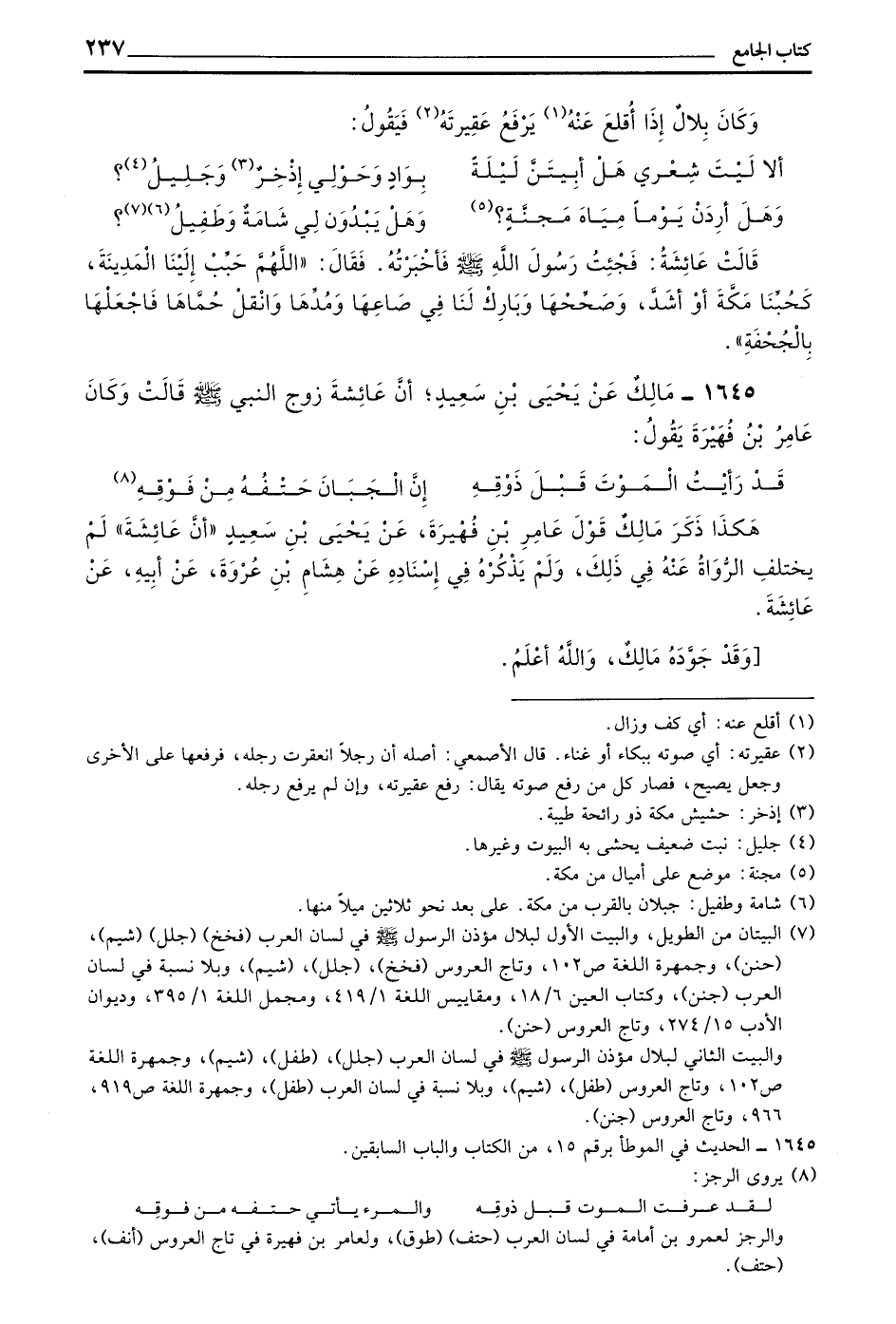 (أَلَا لَيْتَ شِعْرِي هَلْ أَبِيتَنَّ لَيْلَةً ... بِوَادٍ وَحَوْلِي إِذْخِرٌ وَجَلِيلُ)