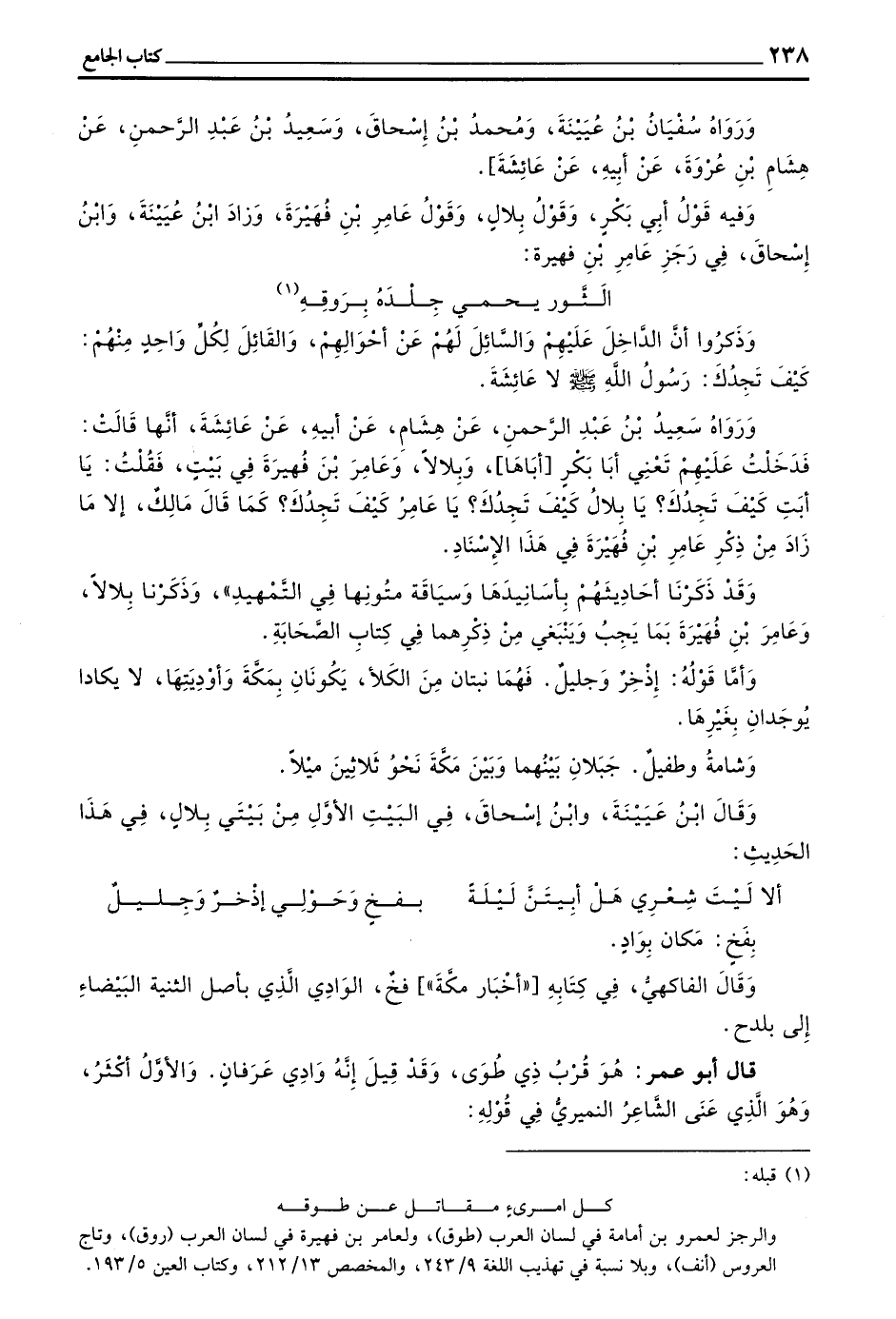 وَفِيهِ قَوْلُ أَبِي بَكْرٍ وَقَوْلُ بِلَالٍ وَقَوْلُ عَامِرِ بْنِ فهيرة وزاد بن عيينة وبن إِسْحَاقَ فِي رَجَزِ عَامِرِ بْنِ فُهَيْرَةَ