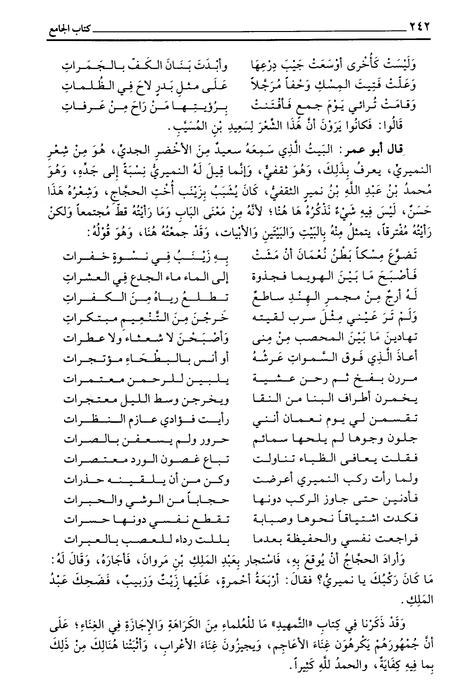 قَالَ أَبُو عُمَرَ الْبَيْتُ الَّذِي سَمِعَهُ سَعِيدٌ مِنَ الْأَخْضَرِ الْجِدِّيِّ هُوَ مِنْ شِعْرِ النُّمَيْرِيِّ يُعْرَفُ بِذَلِكَ وَهُوَ ثَقَفِيٌّ وَإِنَّمَا قِيلَ لَهُ النُّمَيْرِيُّ نِسْبَةً إِلَى جَدِّهِ وَهُوَ مُحَمَّدُ بْنُ عَبْدِ اللَّهِ بْنِ نُمَيْرٍ الثَّقَفِيُّ كَانَ يُشَبِّبُ بِزَيْنَبَ أُخْتِ الْحَجَّاجِ وَشِعْرُهُ هَذَا حَسَنٌ لَيْسَ فِيهِ شَيْءٌ نَذْكُرُهُ ها هنا لِأَنَّهُ مِنْ مَعْنَى الْبَابِ وَمَا رَأَيْتُهُ قَطُّ مُجْتَمِعًا وَلَكِنْ رَأَيْتُهُ مُفْتَرِقًا يَتَمَثَّلُ مِنْهُ بِالْبَيْتِ وَالْبَيْتَيْنِ وَالْأَبْيَاتِ وَقَدْ جَمَعْتُهُ هُنَا وَهُوَ قَوْلُهُ