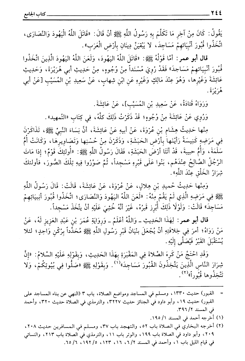 قَالَ أَبُو عُمَرَ أَمَّا قَوْلُهُ صَلَّى اللَّهُ عَلَيْهِ وَسَلَّمَ قَاتَلَ اللَّهُ الْيَهُودَ وَلَعَنَ اللَّهُ الْيَهُودَ الَّذِينَ اتَّخَذُوا قُبُورَ أَنْبِيَائِهِمْ مَسَاجِدَ فَقَدْ رُوِيَ مُسْنَدًا مِنْ وُجُوهٍ مِنْ حَدِيثِ أَبِي هُرَيْرَةَ وَحَدِيثِ عَائِشَةَ وَغَيْرِهَا وَهُوَ عِنْدَ مَالِكٍ وغيره عن بن شِهَابٍ عَنْ سَعِيدِ بْنِ الْمُسَيَّبِ عَنْ أَبِي هُرَيْرَةَ