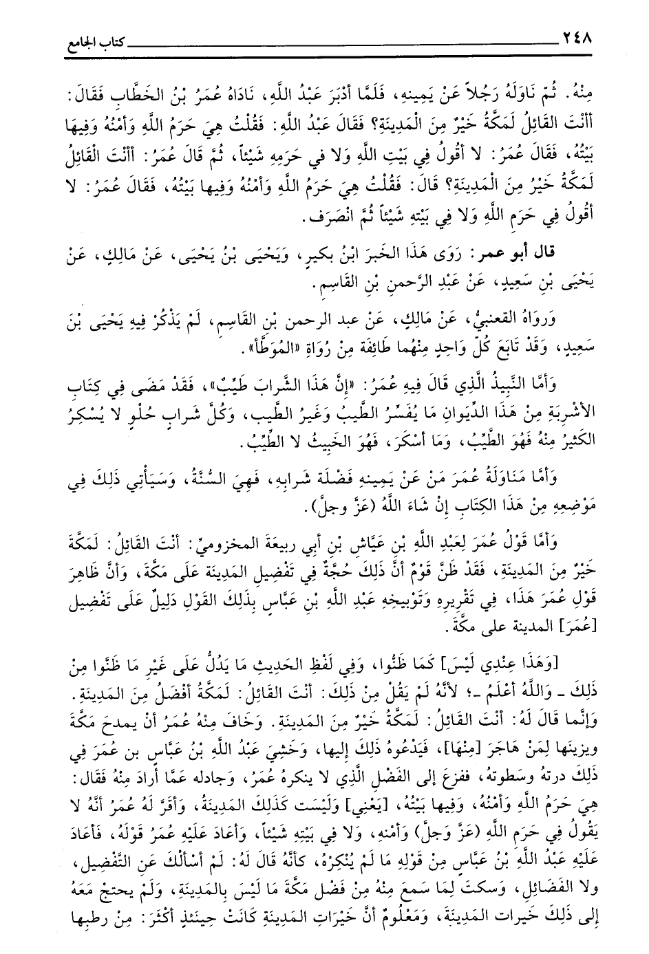 وَأَمَّا قَوْلُ عُمَرَ لِعَبْدِ اللَّهِ بْنَ عَيَّاشِ بْنِ أَبِي رَبِيعَةَ الْمَخْزُومِيَّ أَنْتَ الْقَائِلُ لَمَكَّةُ خَيْرٌ مِنَ الْمَدِينَةِ فَقَدْ ظَنَّ قَوْمٌ أَنَّ ذَلِكَ حُجَّةٌ فِي تَفْضِيلِ الْمَدِينَةِ عَلَى مَكَّةَ وَأَنَّ ظَاهِرَ قَوْلِ عُمَرَ هَذَا فِي تَقْرِيرِهِ وَتَوْبِيخِهِ عَبْدَ اللَّهِ بْنَ عَبَّاسٍ بِذَلِكَ الْقَوْلِ دَلِيلٌ عَلَى تَفْضِيلِ عُمَرَ الْمَدِينَةَ عَلَى مَكَّةَ