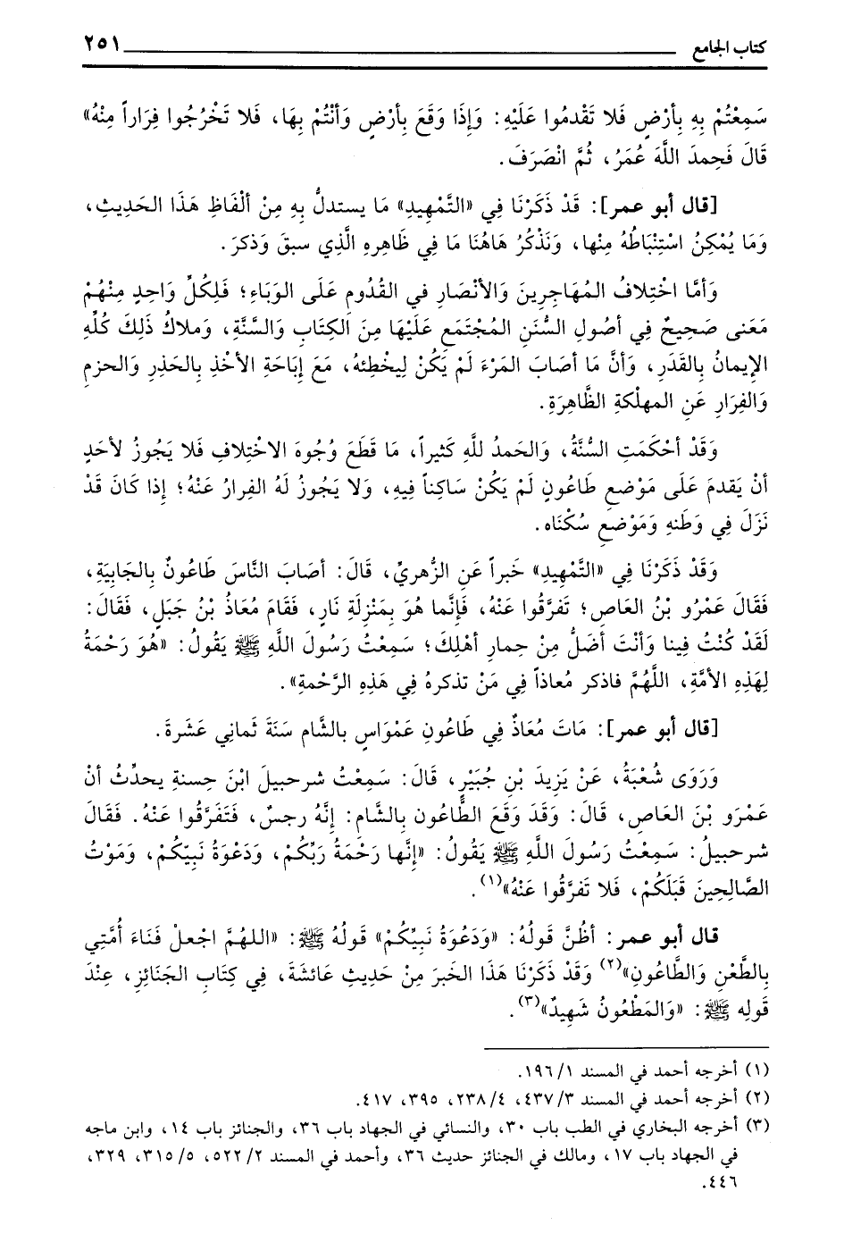 وَقَدْ ذَكَرْنَا فِي التَّمْهِيدِ خَبَرًا عَنِ الزُّهْرِيِّ قَالَ أصاب الناس الطاعون بِالْجَابِيَةِ فَقَالَ عَمْرُو بْنُ الْعَاصِ تَفَرَّقُوا عَنْهُ فَإِنَّمَا هُوَ بِمَنْزِلَةِ نَارٍ فَقَامَ مُعَاذُ بْنُ جَبَلٍ فَقَالَ لَقَدْ كُنْتَ فِينَا وَأَنْتَ أَضَلُّ مِنْ حِمَارِ أَهْلِكَ سَمِعْتُ رَسُولَ اللَّهِ صَلَّى اللَّهُ عَلَيْهِ وَسَلَّمَ يَقُولُ هُوَ رَحْمَةٌ لِهَذِهِ الْأُمَّةِ اللَّهُمَّ فَاذْكُرْ مُعَاذًا فِي مَنْ تَذْكُرُهُ فِي هَذِهِ الرَّحْمَةِ