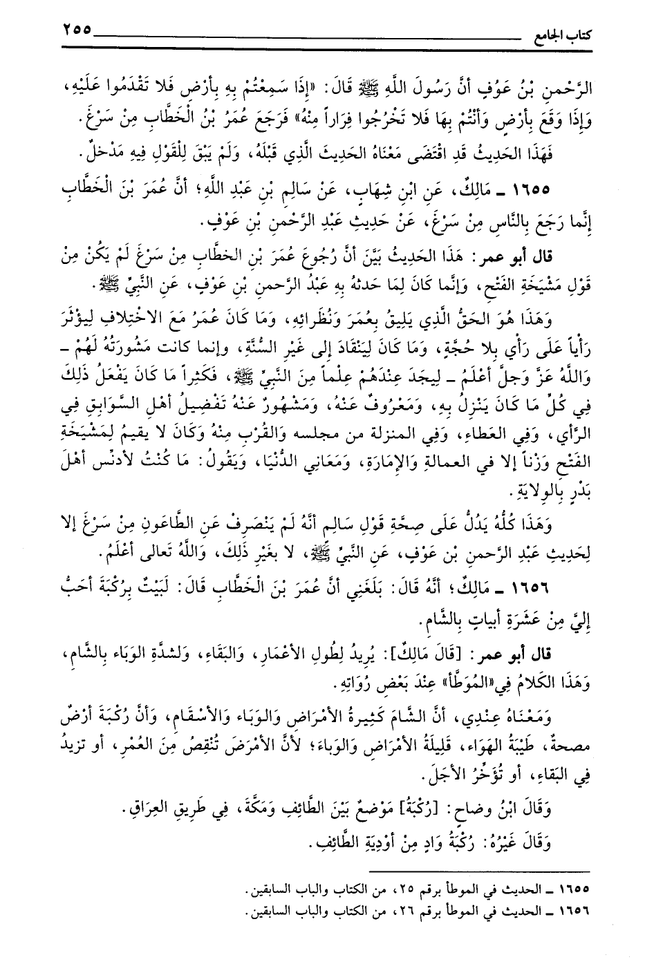 1655 - مالك عن بن شِهَابٍ عَنْ سَالِمِ بْنِ عَبْدِ اللَّهِ أَنَّ عُمَرَ بْنَ الْخَطَّابِ إِنَّمَا رَجَعَ بِالنَّاسِ مِنْ سَرْغَ عَنْ حَدِيثِ عَبْدِ الرَّحْمَنِ بْنِ عَوْفٍ