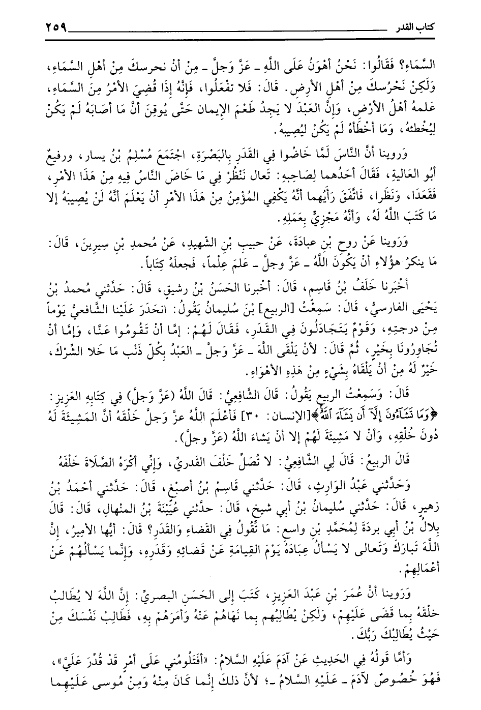 قَالَ الرَّبِيعُ قَالَ لِي الشَّافِعِيُّ لَا تُصَلِّ خَلْفَ الْقَدَرِيِّ وَإِنِّي أَكْرَهُ الصَّلَاةَ خَلْفَهُ وَحَدَّثَنِي عَبْدُ الْوَارِثِ قَالَ حَدَّثَنِي قَاسِمُ بْنُ أَصْبَغَ قَالَ حَدَّثَنِي أَحْمَدُ بْنُ زُهَيْرٍ قَالَ حَدَّثَنِي سُلَيْمَانُ بْنُ أَبِي شَيْخٍ قَالَ حَدَّثَنِي عُيَيْنَةُ بْنُ الْمِنْهَالِ قَالَ قَالَ بِلَالُ بْنُ أَبِي بُرْدَةَ لِمُحَمَّدِ بْنِ وَاسِعٍ مَا تَقُولُ فِي الْقَضَاءِ وَالْقَدَرِ قَالَ أَيُّهَا الْأَمِيرُ إِنَّ اللَّهَ تَبَارَكَ وَتَعَالَى لَا يَسْأَلُ عِبَادَهُ يَوْمَ الْقِيَامَةِ عَنْ قَضَائِهِ وَقَدَرِهِ وَإِنَّمَا يَسْأَلُهُمْ عَنْ أَعْمَالِهِمْ