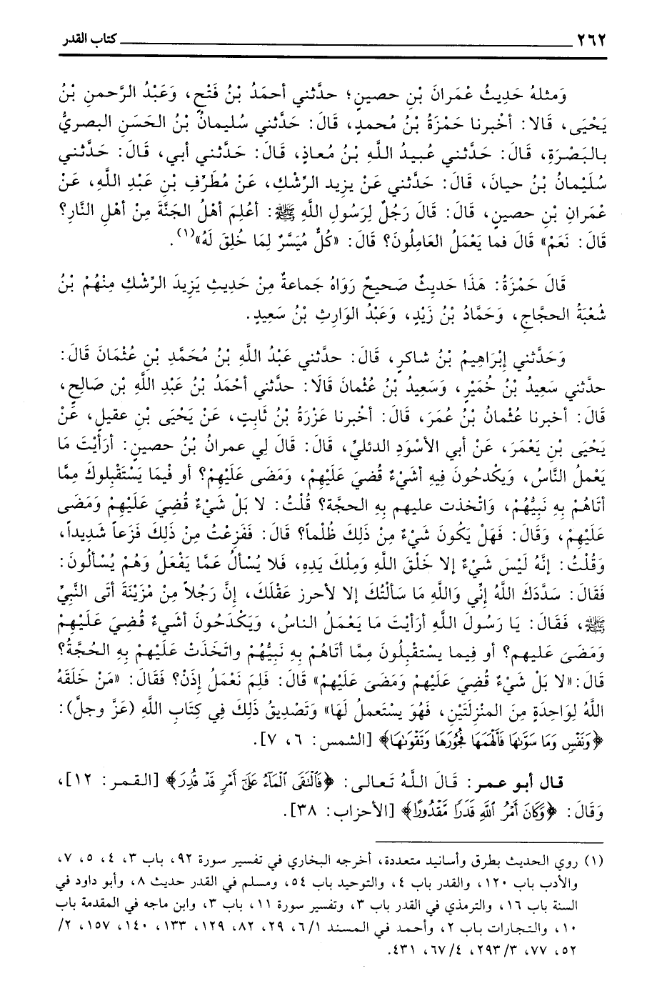 وَحَدَّثَنِي إِبْرَاهِيمُ بْنُ شَاكِرٍ قَالَ حَدَّثَنِي عَبْدُ اللَّهِ بْنُ مُحَمَّدِ بْنِ عُثْمَانَ قَالَ حَدَّثَنِي سَعِيدُ بْنُ خُمَيْرٍ وَسَعِيدُ بْنُ عُثْمَانَ قَالَا حَدَّثَنِي أَحْمَدُ بْنُ عَبْدِ اللَّهِ بْنِ صَالِحٍ قَالَ أَخْبَرَنَا عُثْمَانُ بْنُ عُمَرَ قَالَ أَخْبَرَنَا عَزْرَةُ بْنُ ثَابِتٍ عَنْ يَحْيَى بْنِ عُقَيْلٍ عَنْ يَحْيَى بْنِ يَعْمُرَ عَنْ أَبِي الْأُسُودِ الدُّئِلِيِّ قَالَ قَالَ لِي عِمْرَانُ بْنُ حُصَيْنٍ أَرَأَيْتَ مَا يَعْمَلُ النَّاسُ وَيَكْدَحُونَ فِيهِ أَشَيْءٌ قُضِيَ عَلَيْهِمْ وَمَضَى عَلَيْهِمْ أَوْ فِيمَا يَسْتَقْبِلُوكَ مِمَّا أَتَاهُمْ بِهِ نَبِيُّهُمْ وَاتُّخِذَتْ عَلَيْهِمْ بِهِ الْحُجَّةُ قُلْتُ لَا بَلْ شَيْءٌ قُضِيَ عَلَيْهِمْ وَمَضَى عَلَيْهِمْ وَقَالَ فَهَلْ يَكُونُ شَيْءٌ مِنْ ذَلِكَ ظُلْمًا قَالَ فَفَزِعْتُ مِنْ ذَلِكَ فَزَعًا شَدِيدًا وَقُلْتُ إِنَّهُ لَيْسَ شَيْءٌ إِلَّا خَلْقُ اللَّهِ وَمِلْكُ يَدِهِ فَلَا يُسْأَلُ عَمَّا يَفْعَلُ وَهُمْ يُسْأَلُونَ فَقَالَ سَدَّدَكَ اللَّهُ إِنِّي وَاللَّهِ مَا سَأَلْتُكَ إِلَّا لَأَحْرِزَ عَقْلَكَ إِنَّ رَجُلًا مِنْ مُزَيْنَةَ أَتَى النَّبِيَّ صَلَّى اللَّهُ عَلَيْهِ وَسَلَّمَ فَقَالَ يَا رَسُولَ اللَّهِ أَرَأَيْتَ مَا يَعْمَلُ النَّاسُ وَيَكْدَحُونَ أَشَيْءٌ قُضِيَ عَلَيْهِمْ وَمَضَى عَلَيْهِمْ أَوْ فِيمَا يَسْتَقْبِلُونَ مِمَّا أَتَاهُمْ بِهِ نَبِيُّهُمْ وَاتُّخِذَتْ عَلَيْهِمْ بِهِ الْحُجَّةُ قَالَ لَا بَلْ شَيْءٌ قُضِيَ عَلَيْهِمْ وَمَضَى عَلَيْهِمْ قَالَ فَلِمَ نَعْمَلُ إِذَنْ فَقَالَ مَنْ خَلَقَهُ اللَّهُ لِوَاحِدَةٍ مِنَ الْمَنْزِلَتَيْنِ فَهُوَ يُسْتَعْمَلُ لَهَا وَتَصْدِيقُ ذَلِكَ فِي كِتَابِ اللَّهِ (عَزَّ وَجَلَّ) (وَنَفْسٍ وَمَا سَوَّاهَا فَأَلْهَمَهَا فُجُورَهَا وَتَقْوَاهَا) الشَّمْسِ 6 7