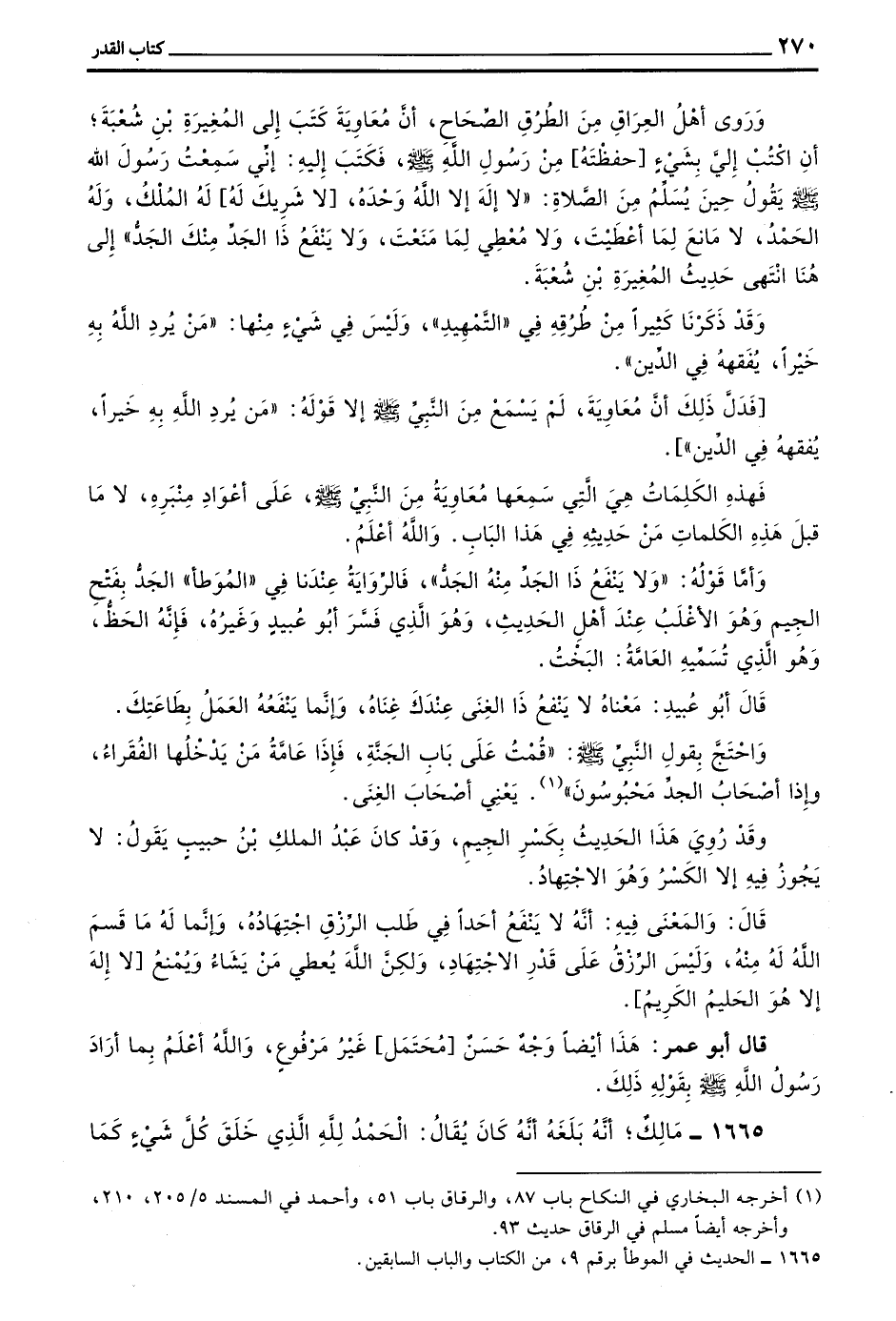 وَرَوَى أَهْلُ الْعِرَاقِ مِنَ الطُّرُقِ الصِّحَاحِ أَنَّ مُعَاوِيَةَ كَتَبَ إِلَى الْمُغِيرَةِ بْنِ شُعْبَةَ أَنِ اكْتُبْ إِلَيَّ بِشَيْءٍ حَفِظْتَهُ مِنْ رَسُولِ اللَّهِ صَلَّى اللَّهُ عَلَيْهِ وَسَلَّمَ فَكَتَبَ إِلَيْهِ إِنِّي سَمِعْتُ رَسُولَ اللَّهِ صَلَّى اللَّهُ عَلَيْهِ وَسَلَّمَ يَقُولُ حِينَ يُسَلِّمُ مِنَ الصَّلَاةِ لَا إِلَهَ إِلَّا اللَّهُ وَحْدَهُ لَا شَرِيكَ لَهُ لَهُ الْمُلْكُ وَلَهُ الْحَمْدُ لَا مَانِعَ لِمَا أَعْطَيْتَ وَلَا مُعْطِيَ لِمَا مَنَعْتَ وَلَا يَنْفَعُ ذَا الْجَدِّ مِنْكَ الْجَدُّ إِلَى هُنَا انْتَهَى حَدِيثُ الْمُغِيرَةِ بْنِ شُعْبَةَ