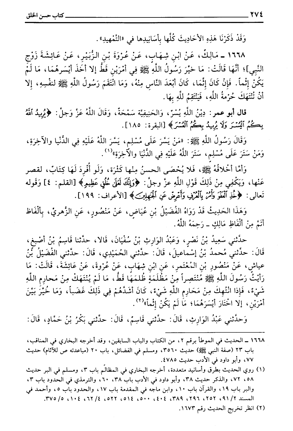 1668 - مالك عن بن شِهَابٍ عَنْ عُرْوَةَ بْنِ الزُّبَيْرِ عَنْ عَائِشَةَ زوج النبي أَنَّهَا قَالَتْ مَا خُيِّرَ رَسُولُ اللَّهِ صَلَّى اللَّهُ عَلَيْهِ وَسَلَّمَ فِي أَمْرَيْنِ قَطُّ إِلَّا أَخَذَ أَيْسَرَهُمَا مَا لَمْ يَكُنْ إِثْمًا