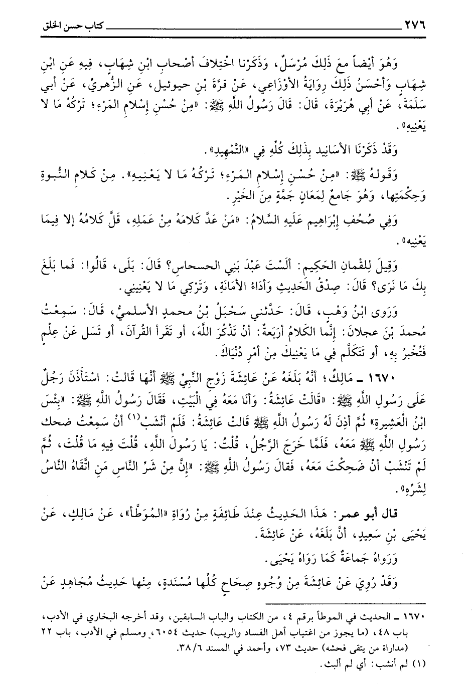 1670 - مَالِكٌ أَنَّهُ بَلَغَهُ عَنْ عَائِشَةَ زَوْجِ النَّبِيِّ صَلَّى اللَّهُ عَلَيْهِ وَسَلَّمَ أَنَّهَا قَالَتِ اسْتَأْذَنَ رَجُلٌ عَلَى رَسُولِ اللَّهِ صَلَّى اللَّهُ عَلَيْهِ وَسَلَّمَ قَالَتْ عَائِشَةُ وَأَنَا مَعَهُ فِي الْبَيْتِ فَقَالَ رَسُولُ اللَّهِ صَلَّى اللَّهُ عَلَيْهِ وَسَلَّمَ بئس بن الْعَشِيرَةِ ثُمَّ أَذِنَ لَهُ رَسُولُ اللَّهِ صَلَّى اللَّهُ عَلَيْهِ وَسَلَّمَ قَالَتْ عَائِشَةُ فَلَمْ أَنْشَبْ أَنْ سَمِعْتُ ضَحِكَ رَسُولِ اللَّهِ صَلَّى اللَّهُ عَلَيْهِ وَسَلَّمَ مَعَهُ فَلَمَّا خَرَجَ الرَّجُلُ قُلْتُ يارسول اللَّهِ قُلْتَ فِيهِ مَا قُلْتَ ثُمَّ لَمْ تَنْشَبْ أَنْ ضَحِكْتَ مَعَهُ فَقَالَ رَسُولُ اللَّهِ صَلَّى اللَّهُ عَلَيْهِ وَسَلَّمَ إِنَّ مِنْ شَرِّ النَّاسِ مَنِ اتَّقَاهُ النَّاسُ لِشَرِّهِ