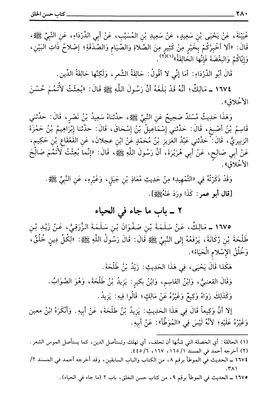 1675 - مَالِكٌ عَنْ سَلَمَةَ بْنِ صَفْوَانَ بْنِ سَلَمَةَ الزُّرَقِيِّ عَنْ زَيْدِ بْنِ طَلْحَةَ بْنِ رُكَانَةَ يَرْفَعُهُ إلى النبي قَالَ قَالَ رَسُولُ اللَّهِ صَلَّى اللَّهُ عَلَيْهِ وَسَلَّمَ لِكُلِّ دِينٍ خُلُقٌ وَخُلُقُ الْإِسْلَامِ الْحَيَاءُ