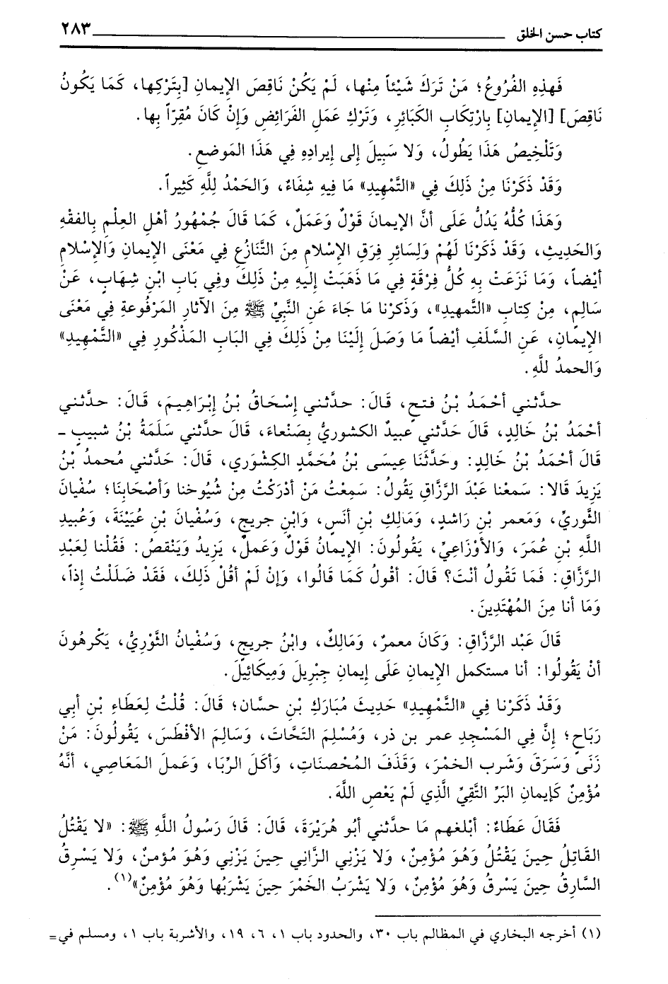 حَدَّثَنِي أَحْمَدُ بْنُ فَتْحٍ قَالَ حَدَّثَنِي إِسْحَاقُ بْنُ إِبْرَاهِيمَ قَالَ حَدَّثَنِي أَحْمَدُ بْنُ خَالِدٍ قَالَ حَدَّثَنِي عُبَيْدٌ الْكِشْوَرِيُّ بِصَنْعَاءَ قَالَ حَدَّثَنِي سَلَمَةُ بْنُ شَبِيبٍ - قَالَ أَحْمَدُ بْنُ خَالِدٍ وَحَدَّثَنَا عِيسَى بْنُ مُحَمَّدٍ الْكِشْوَرِيُّ قَالَ حَدَّثَنِي مُحَمَّدُ بْنُ يَزِيدَ قَالَا سَمِعْنَا عَبْدَ الرَّزَّاقِ يَقُولُ سَمِعْتُ مَنْ أَدْرَكْتُ مِنْ شُيُوخِنَا وَأَصْحَابِنَا سُفْيَانَ الثَّوْرِيَّ وَمَعْمَرَ بْنَ راشد ومالك بن أنس وبن جُرَيْجٍ وَسُفْيَانَ بْنَ عُيَيْنَةَ وَعُبَيْدَ اللَّهِ بْنَ عُمَرَ وَالْأَوْزَاعِيَّ يَقُولُونَ الْإِيمَانُ قَوْلٌ وَعَمَلٌ يَزِيدُ وَيَنْقُصُ فَقُلْنَا لِعَبْدِ الرَّزَّاقِ فَمَا تَقُولُ أَنْتَ قَالَ أَقُولُ كَمَا قَالُوا وَإِنْ لَمْ أَقُلْ ذَلِكَ فَقَدْ ضَلَلْتُ إِذًا وَمَا أَنَا مِنَ الْمُهْتَدِينَ