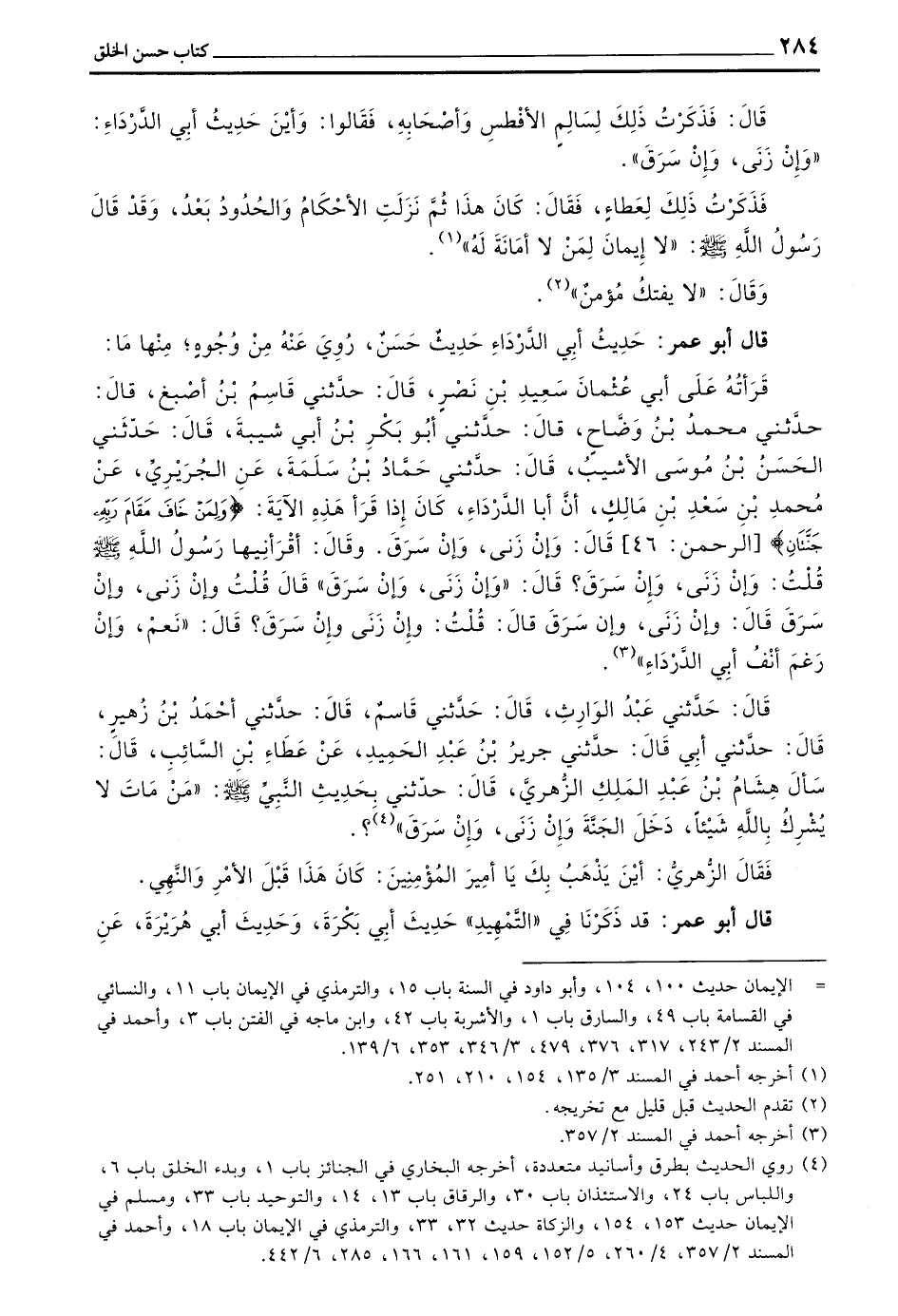 قَرَأْتُهُ عَلَى أَبِي عُثْمَانَ سَعِيدُ بْنُ نَصْرٍ قَالَ حَدَّثَنِي قَاسِمُ بْنُ أَصْبَغَ قَالَ حَدَّثَنِي مُحَمَّدُ بْنُ وَضَّاحٍ قَالَ حَدَّثَنِي أَبُو بَكْرِ بْنُ أَبِي شَيْبَةَ قَالَ حَدَّثَنِي الْحَسَنُ بْنُ مُوسَى الْأَشْيَبُ قَالَ حَدَّثَنِي حَمَّادُ بْنُ سَلَمَةَ عَنِ الْجُرَيْرِيِّ عَنْ مُحَمَّدِ بْنِ سَعْدِ بْنِ مَالِكٍ أَنَّ أَبَا الدَّرْدَاءِ كَانَ إِذَا قَرَأَ هَذِهِ الْآيَةَ (وَلِمَنْ خَافَ مَقَامَ رَبِّهِ جَنَّتَانِ) الرَّحْمَنِ 46 قَالَ وَإِنْ زَنَى وَإِنْ سَرَقَ