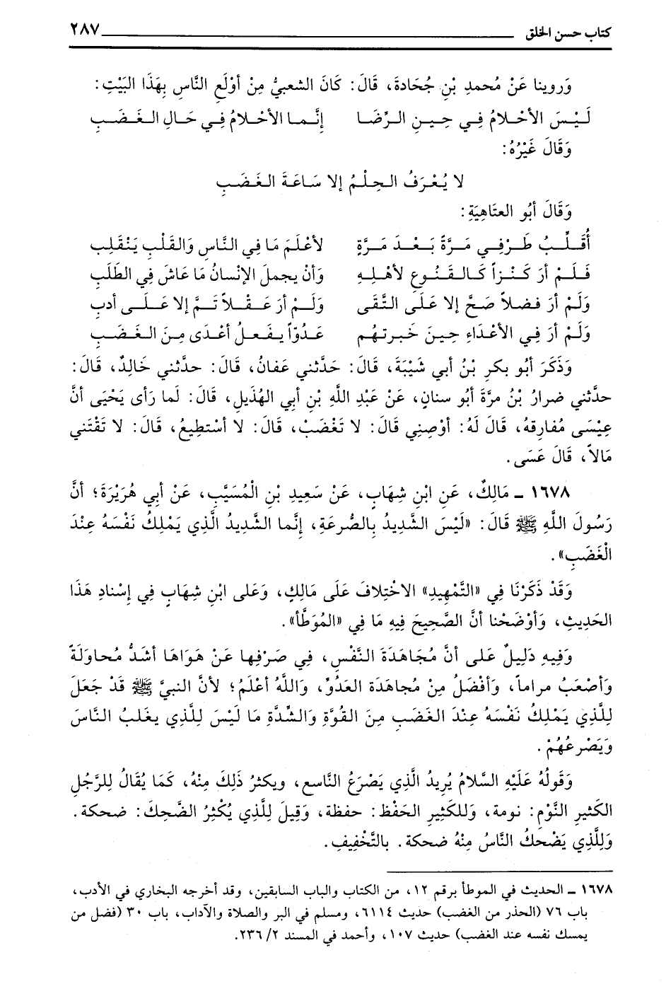 1678 - مالك عن بن شِهَابٍ عَنْ سَعِيدِ بْنِ الْمُسَيَّبِ عَنْ أَبِي هُرَيْرَةَ أَنَّ رَسُولَ اللَّهِ صَلَّى اللَّهُ عَلَيْهِ وَسَلَّمَ قَالَ لَيْسَ الشَّدِيدُ بِالصُّرَعَةِ إِنَّمَا الشَّدِيدُ الَّذِي يَمْلِكُ نَفْسَهُ عِنْدَ الْغَضَبِ