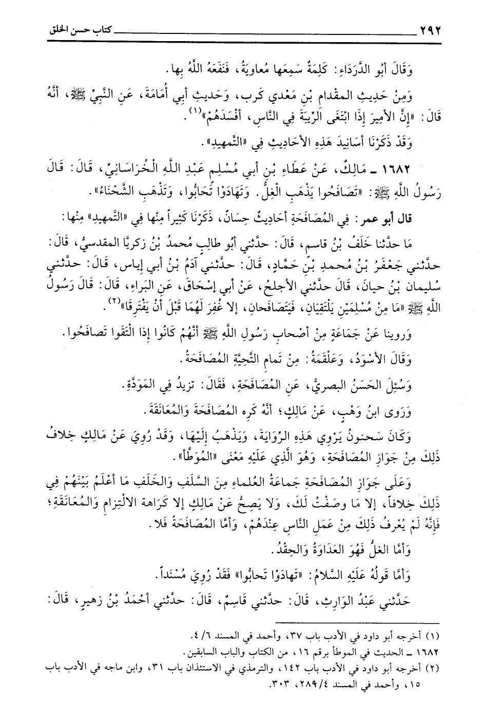وَقَدْ ذَكَرْنَا أَسَانِيدَ هَذِهِ الْأَحَادِيثِ فِي التَّمْهِيدِ 1682 - مَالِكٌ عَنْ عَطَاءِ بْنِ أَبِي مُسْلِمٍ عَبْدِ اللَّهِ الخرساني قَالَ قَالَ رَسُولُ اللَّهِ صَلَّى اللَّهُ عَلَيْهِ وَسَلَّمَ تَصَافَحُوا يَذْهَبُ الْغِلُّ