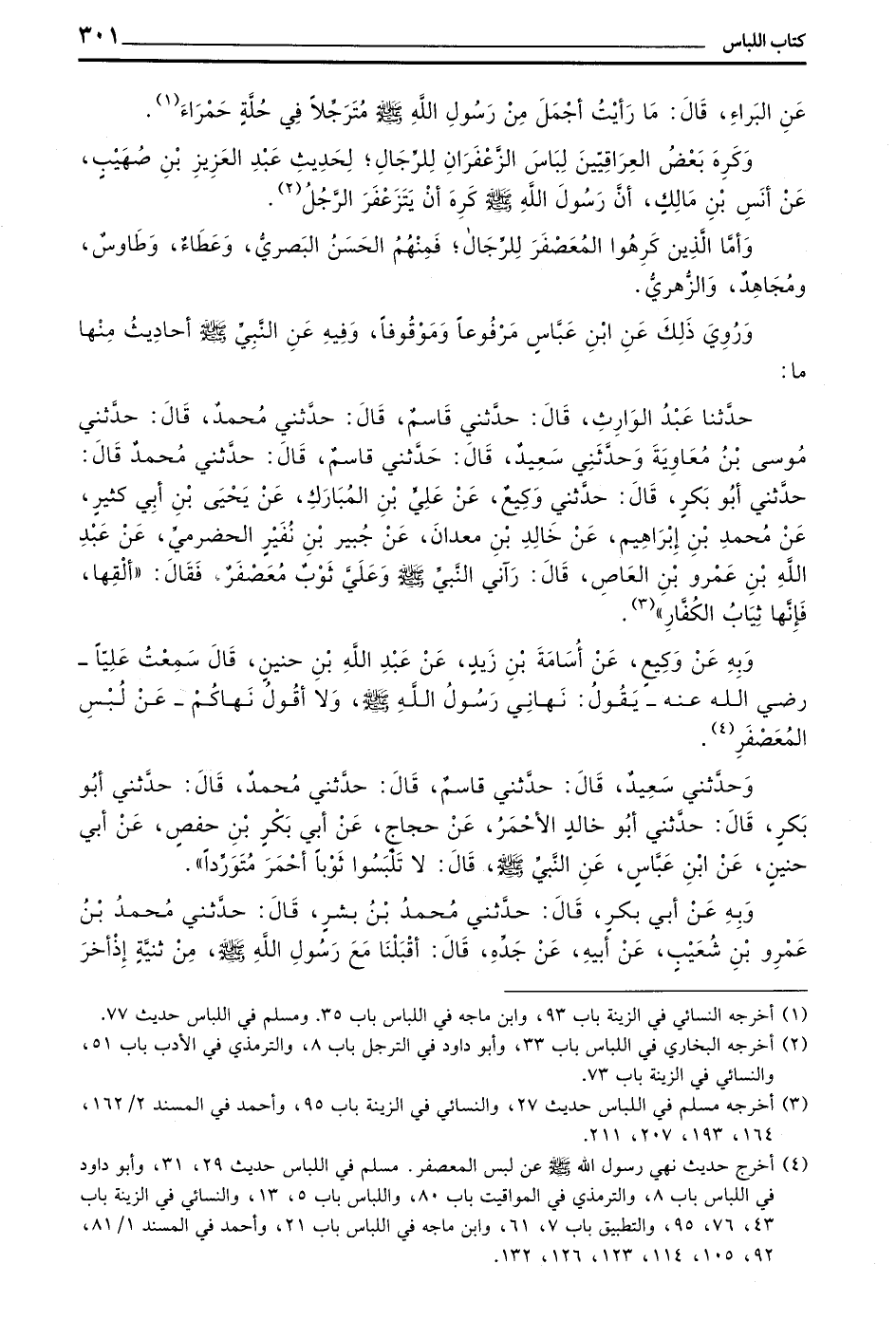 وَرُوِيَ ذلك عن بن عَبَّاسٍ مَرْفُوعًا وَمَوْقُوفًا وَفِيهِ عَنِ النَّبِيِّ صَلَّى اللَّهُ عَلَيْهِ وَسَلَّمَ أَحَادِيثُ مِنْهَا مَا حَدَّثَنَا عَبْدُ الْوَارِثِ قَالَ حَدَّثَنِي قَاسِمٌ قَالَ حَدَّثَنِي مُحَمَّدُ قَالَ حَدَّثَنِي مُوسَى بْنُ مُعَاوِيَةَ وَحَدَّثَنِي سَعِيدٌ قَالَ حَدَّثَنِي قَاسِمٌ قَالَ حَدَّثَنِي مُحَمَّدٌ قَالَ حَدَّثَنِي أَبُو بَكْرٍ قَالَ حَدَّثَنِي وَكِيعٌ عَنْ عَلِيِّ بْنِ الْمُبَارَكِ عَنْ يَحْيَى بْنِ أَبِي كَثِيرٍ عَنْ مُحَمَّدِ بْنِ إِبْرَاهِيمَ عَنْ خَالِدِ بْنِ مَعْدَانَ عَنْ جُبَيْرِ بْنِ نُفَيْرٍ الْحَضْرَمِيِّ عَنْ عَبْدِ اللَّهِ بْنِ عَمْرِو بْنِ الْعَاصِ قَالَ رَآنِي النَّبِيُّ صَلَّى اللَّهُ عَلَيْهِ وَسَلَّمَ وَعَلَيَّ ثَوْبٌ مُعَصْفَرٌ فَقَالَ أَلْقِهَا فَإِنَّهَا ثِيَابُ الْكُفَّارِ